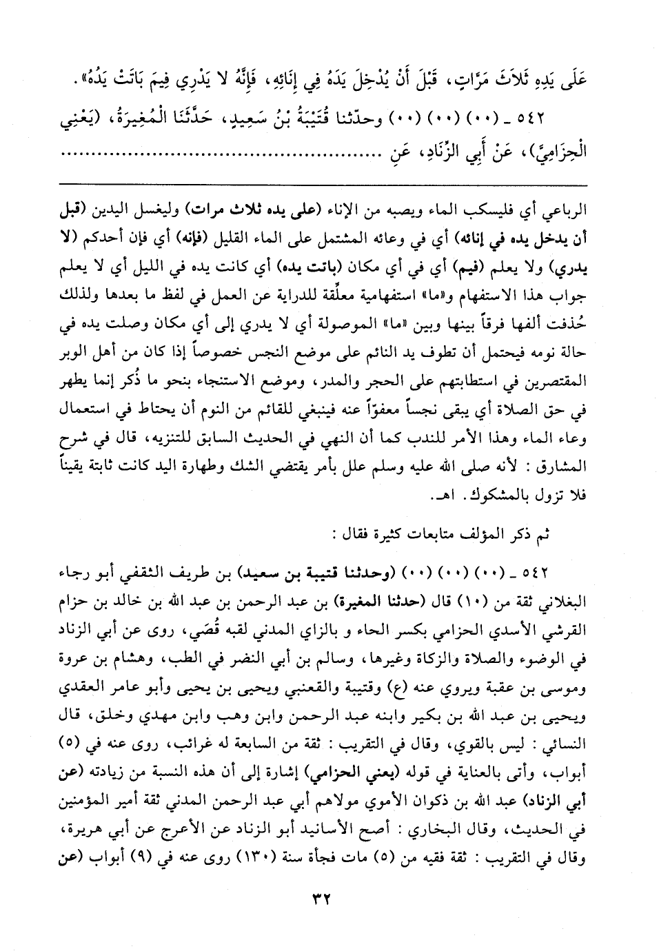 ٥٤٢ - (٠٠) (٠٠) (٠٠) (وحدثنا قتيبة بن سعيد) بن طريف الثقفي أبو رجاء البغلاني ثقة من (١٠) قال (حدثنا المغيرة) بن عبد الرحمن بن عبد الله بن خالد بن حزام القرشي الأسدي الحزامي بكسر الحاء وبالزاي المدني لقبه قُصَي، روى عن أبي الزناد في الوضوء والصلاة والزكاة وغيرها، وسالم بن أبي النضر في الطب، وهشام بن عروة وموسى بن عقبة ويروي عنه (ع) وقتيبة والقعنبي ويحيى بن يحيى وأبو عامر العقدي ويحيى بن عبد الله بن بكير وابنه عبد الرحمن وابن وهب وابن مهدي وخلق، قال النسائي: ليس بالقوي، وقال في التقريب: ثقة من السابعة له غرائب، روى عنه في (٥) أبواب، وأتى بالعناية في قوله (يعني الحزامي) إشارة إلى أن هذه النسبة من زيادته (عن أبي الزناد) عبد الله بن ذكوان الأموي مولاهم أبي عبد الرحمن المدني ثقة أمير المؤمنين في الحديث، وقال البخاري: أصح الأسانيد أبو الزناد عن الأعرج عن أبي هريرة، وقال في التقريب: ثقة فقيه من (٥) مات فجأة سنة (١٣٠) روى عنه في (٩) أبواب (عن