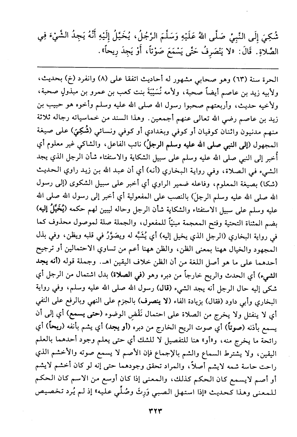 الحرة سنة (٦٣) وهو صحابي مشهور له أحاديث اتفقا على (٨) وانفرد (خ) بحديث، ولأبيه زيد بن عاصم أيضًا صحبة، ولأمه نُسَيبَةَ بنت كعب بن عمرو بن مبذولٍ صحبة، ولأخيه حديث، وأربعتهم صحبوا رسول الله صلى الله عليه وسلم وأخوه هو حبيب بن زيد بن عاصم رضي الله تعالى عنهم أجمعين. وهذا السند من خماسياته رجاله ثلاثة منهم مدنيون واثنان كوفيان أو كوفي وبغدادي أو كوفي ونسائي (شُكِيَ) على صيغة المجهول (إلى النبي صلى الله عليه وسلم الرجلُ) نائب الفاعل، والشاكي غير معلوم أي أُخبر إلى النبي صلى الله عليه وسلم على سبيل الشكاية والاستفتاء شأن الرجل الذي يجد الشيء في الصلاة، وفي رواية البخاري (أنه) أي أن عبد الله بن زيد راوي الحديث (شكا) بصيغة المعلوم، وفاعله ضمير الراوي أي أخبر على سبيل الشكوى (إلى رسول الله صلى الله عليه وسلم الرجلَ) بالنصب على المفعولية أي أخبر إلى رسول الله صلى الله عليه وسلم على سبيل الاستفتاء والشكاية شأن الرجل وحاله ليبين لهم حكمه (يُخَيَّلُ إليه) بضم المثناة التحتية وفتح المعجمة مبنيّا للمفعول، والجملة صلة لموصول محذوف كما في رواية البخاري (الرجل الذي يخيل إليه) أي يُشَبَّه له ويصَوَّرُ في قلبه ويظن، وفي بذل المجهود والخيال ها هنا بمعنى الظن، والظن ها هنا أعم من تساوي الاحتمالين أو ترجيح أحدهما على ما هو أصل اللغة من أن الظن خلاف اليقين اهـ. وجملة قوله (أنه يجد الشيء) أي الحدث والريح خارجًا من دبره وهو (في الصلاة) بدل اشتمال من الرجل أي شكى إليه حال الرجل أنه يجد الشيء (قال) رسول الله صلى الله عليه وسلم، وفي رواية البخاري وأبي داود (فقال) بزيادة الفاء (لا ينصرف) بالجزم على النهي وبالرفع على النفي أي لا ينفتل ولا يخرج من الصلاة على احتمال نَقْضِ الوضوء (حتى يسمع) أي إلى أن يسمع بأذنه (صوتًا) أي صوت الريح الخارج من دبره (أو يجد) أي يشم بأنفه (ريحًا) أي رائحة ما يخرج منه، و"أو" هنا للتفصيل لا للشك أي حتى يعلم وجود أحدهما بالعلم اليقين، ولا يشترط السماع والشم بالإجماع فإن الأصم لا يسمع صوته والأخشم الذي راحت حاسة شمه لا يشم أصلًا، والمراد تحقق وجودهما حتى إنه لو كان أخشم لا يشم أو أصم لا يسمع كان الحكم كذلك، والمعنى إذا كان أوسع من الاسم كان الحكم للمعنى وهذا كحديث "إذا استهل الصبي وَرِثَ وصُلِّي عليه" إذ لم يُرد تخصيص