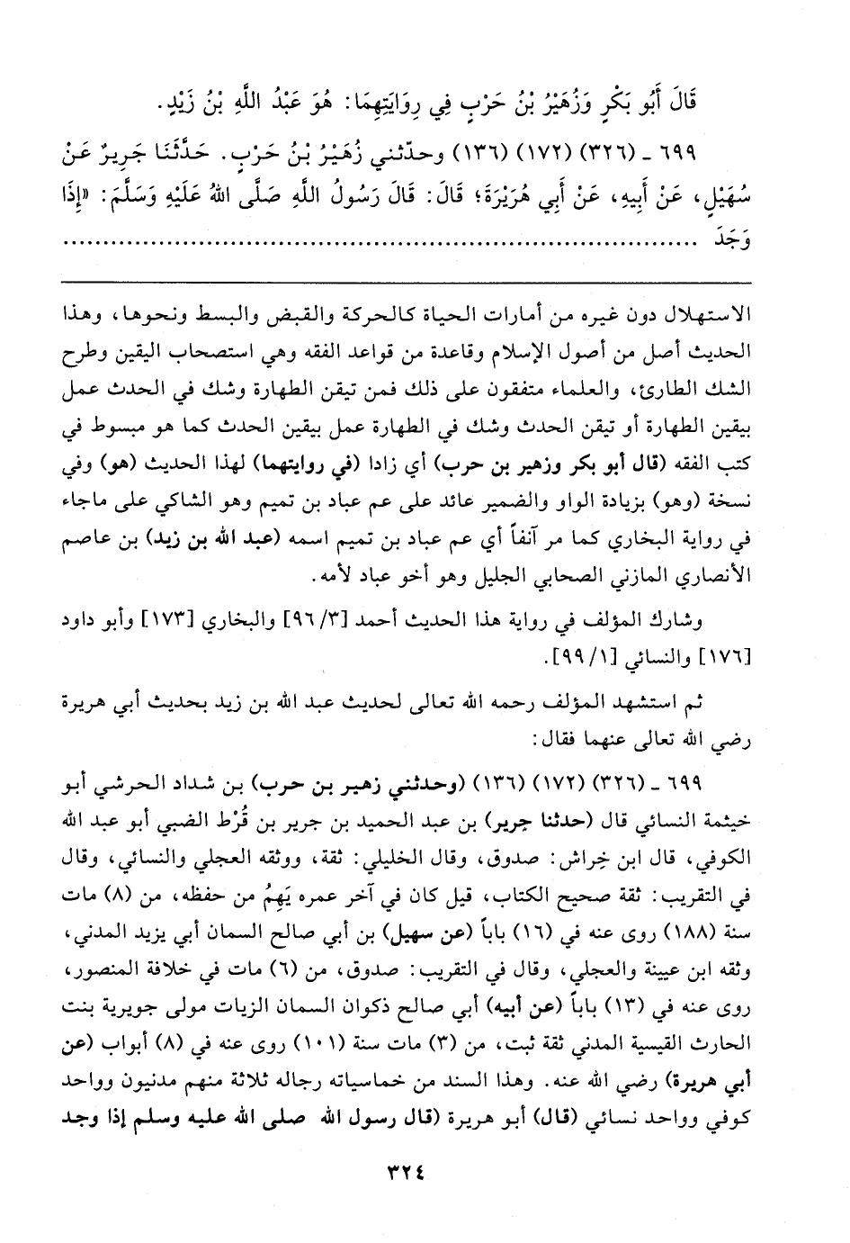 ٦٩٩ - (٣٢٦) (١٧٢) (١٣٦) (وحدثني زهير بن حرب) بن شداد الحرشي أبو خيثمة النسائي قال (حدثنا جرير) بن عبد الحميد بن جرير بن قُرْط الضبي أبو عبد الله الكوفي، قال ابن خِراش: صدوق، وقال الخليلي: ثقة، ووثقه العجلي والنسائي، وقال في التقريب: ثقة صحيح الكتاب، قيل كان في آخر عمره يَهِمُ من حفظه، من (٨) مات سنة (١٨٨) روى عنه في (١٦) بابا (عن سهيل) بن أبي صالح السمان أبي يزيد المدني، وثقه ابن عيينة والعجلي، وقال في التقريب: صدوق، من (٦) مات في خلافة المنصور، روى عنه في (١٣) بابا (عن أبيه) أبي صالح ذكوان السمان الزيات مولى جويرية بنت الحارث القيسية المدني ثقة ثبت، من (٣) مات سنة (١٥١) روى عنه في (٨) أبواب (عن أبي هريرة) رضي الله عنه. وهذا السند من خماسياته رجاله ثلاثة منهم مدنيون وواحد كوفي وواحد نسائي (قال) أبو هريرة (قال رسول الله صلى الله عليه وسلم إذا وجد