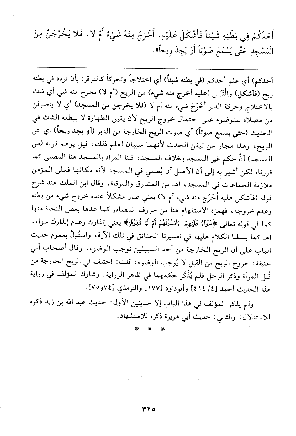 أحدكم) أي علم أحدكم (في بطنه شيئًا) أي اختلاجا وتحركًا كالقرقرة بأن تردد في بطنه ريح (فأشكل) والْتَبَس (عليه أخرج منه شيء) من الريح (أم لا) يخرج منه شي أي شك بالاختلاج وحركة الدبر أَخَرَجَ شيء منه أم لا (فلا يخرجن من المسجد) أي لا ينصرفن من مصلاه للتوضوء على احتمال خروج الريح لأن يقين الطهارة لا يبطله الشك في الحديث (حتى يسمع صوتًا) أي صوت الريح الخارجة من الدبر (أو يجد ريحًا) أي نتن الريح، وهذا مجاز عن تيقن الحدث لأنهما سببان لعلم ذلك، قيل يوهم قوله (من المسجد) أن حكم غير المسجد بخلاف المسجد، قلنا المراد بالمسجد هنا المصلى كما قررناه لكن أشير به إلى أن الأصل أن يُصلي في المسجد لأنه مكانها فعلى المؤمن ملازمة الجماعات في المسجد، اهـ من المشارق والمرقاة، وقال ابن الملك عند شرح قوله (فأشكل عليه أَخَرَج منه شيء أم لا) يعني صار مشكلًا عنده خروج شيء من بطنه وعدم خروجه، فهمزة الاستفهام هنا من حروف المصادر كما عدها بعض النحاة منها كما في قوله تعالى {سَوَاءٌ عَلَيهِمْ أَأَنْذَرْتَهُمْ أَمْ لَمْ تُنْذِرْهُمْ} يعني إنذارك وعدم إنذارك سواء، اهـ كما بسطنا الكلام عليها في تفسيرنا الحدائق في تلك الآية، واستُدِلَّ بعموم حديث الباب على أن الريح الخارجة من أحد السبيلين توجب الوضوء، وقال أصحاب أبي حنيفة: خروج الريح من القبل لا يُوجب الوضوء، قلت: اختلف في الريح الخارجة من قُبل المرأة وذكر الرجل فلم يُذْكَر حكمهما في ظاهر الرواية. وشارك المؤلف في رواية هذا الحديث أحمد [٤/ ٤١٤] وأبو داود [١٧٧] والترمذي [٧٤ و ٧٥].