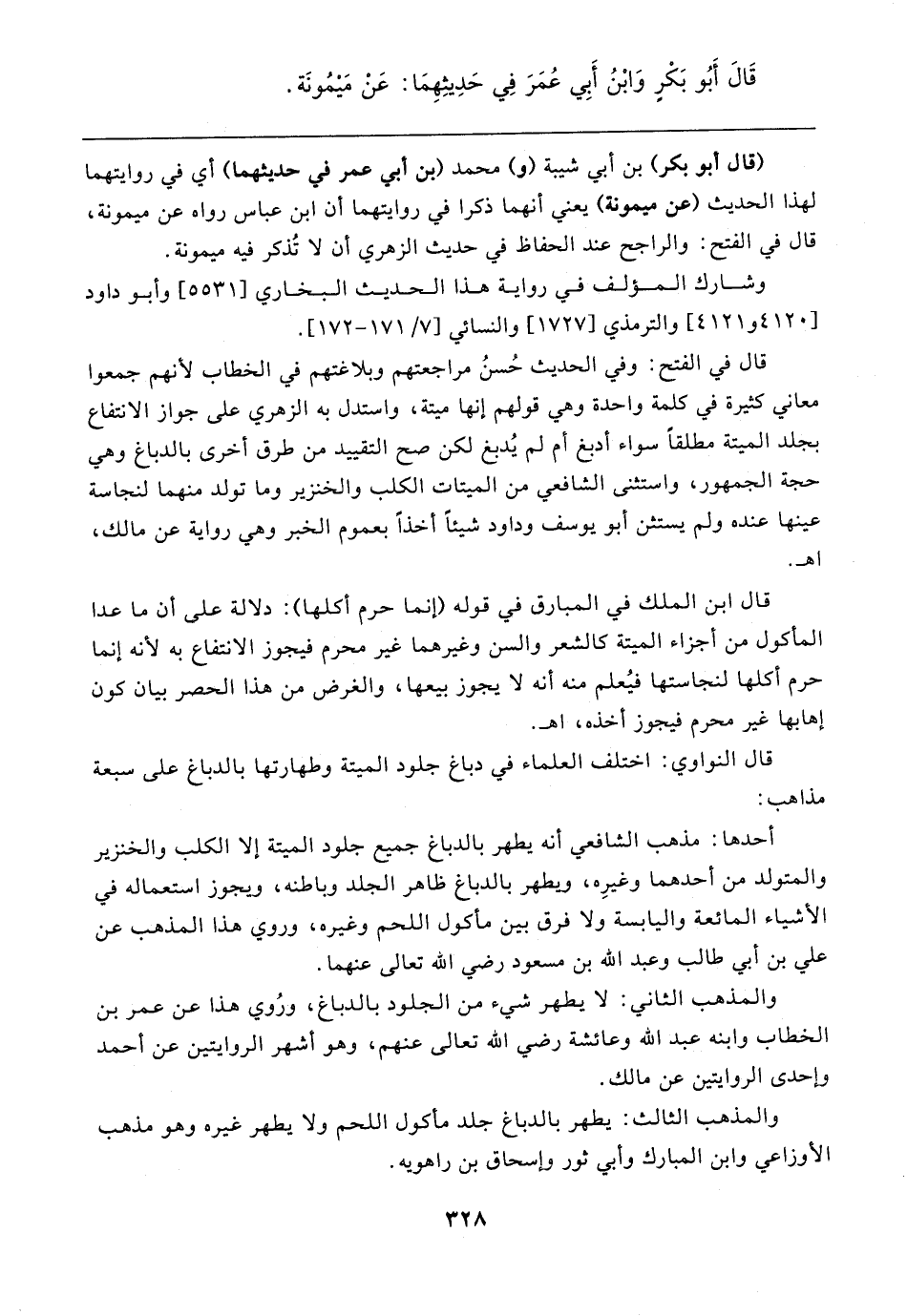 قال في الفتح: وفي الحديث حُسنُ مراجعتهم وبلاغتهم في الخطاب لأنهم جمعوا معاني كثيرة في كلمة واحدة وهي قولهم إنها ميتة، واستدل به الزهري على جواز الانتفاع بجلد الميتة مطلقًا سواء أدبغ أم لم يُدبغ لكن صح التقييد من طرق أخرى بالدباغ وهي حجة الجمهور، واستثنى الشافعي من الميتات الكلب والخنزير وما تولد منهما لنجاسسة عينها عنده ولم يستثن أبو يوسف وداود شيئًا أخذًا بعموم الخبر وهي رواية عن مالك، اهـ.
