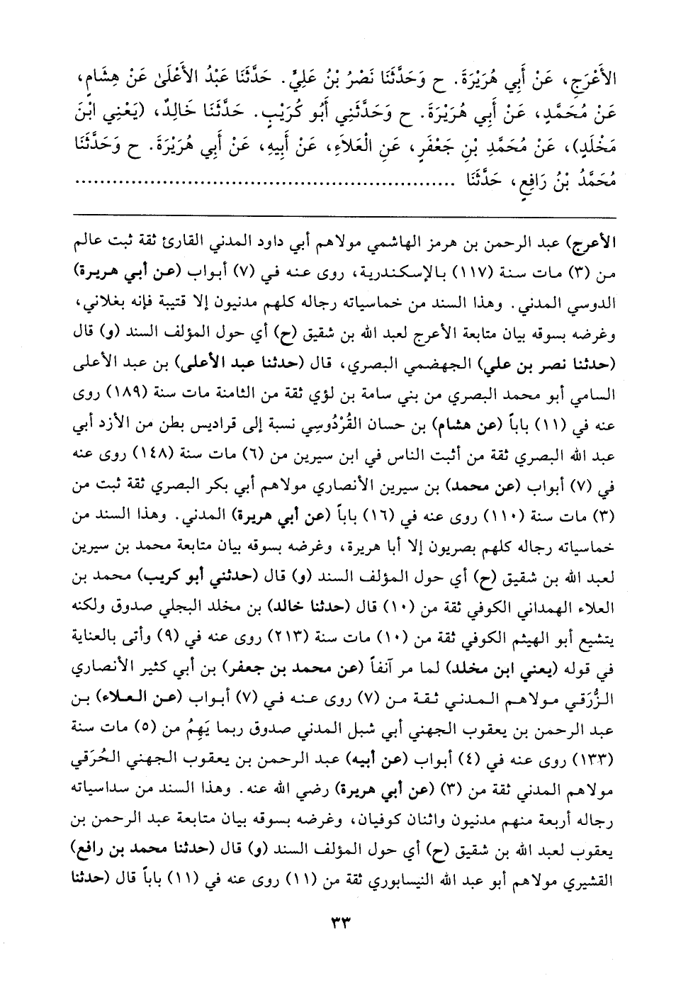 الأعرج) عبد الرحمن بن هرمز الهاشمي مولاهم أبي داود المدني القارئ ثقة ثبت عالم من (٣) مات سنة (١١٧) بالإسكندرية، روى عنه في (٧) أبواب (عن أبي هريرة) الدوسي المدني. وهذا السند من خماسياته رجاله كلهم مدنيون إلا قتيبة فإنه بغلاني، وغرضه بسوقه بيان متابعة الأعرج لعبد الله بن شقيق (ح) أي حول المؤلف السند (و) قال (حدثنا نصر بن علي) الجهضمي البصري، قال (حدثنا عبد الأعلى) بن عبد الأعلى السامي أبو محمد البصري من بني سامة بن لؤي ثقة من الثامنة مات سنة (١٨٩) روى عنه في (١١) بابا (عن هشام) بن حسان القُرْدُوسِي نسبة إلى قراديس بطن من الأزد أبي عبد الله البصري ثقة من أثبت الناس في ابن سيرين من (٦) مات سنة (١٤٨) روى عنه في (٧) أبواب (عن محمد) بن سيرين الأنصاري مولاهم أبي بكر البصري ثقة ثبت من (٣) مات سنة (١١٠) روى عنه في (١٦) بابا (عن أبي هريرة) المدني. وهذا السند من خماسياته رجاله كلهم بصريون إلا أبا هريرة، وغرضه بسوقه بيان متابعة محمد بن سيرين لعبد الله بن شقيق (ح) أي حول المؤلف السند (و) قال (حدثني أبو كريب) محمد بن العلاء الهمداني الكوفي ثقة من (١٠) قال (حدثنا خالد) بن مخلد البجلي صدوق ولكنه يتشيع أبو الهيثم الكوفي ثقة من (١٠) مات سنة (٢١٣) روى عنه في (٩) وأتى بالعناية في قوله (يعني ابن مخلد) لما مر آنفًا (عن محمد بن جعفر) بن أبي كثير الأنصاري الزُّرَقي مولاهم المدني ثقة من (٧) روى عنه في (٧) أبواب (عن العلاء) بن عبد الرحمن بن يعقوب الجهني أبي شبل المدني صدوق ربما يَهِمُ من (٥) مات سنة (١٣٣) روى عنه في (٤) أبواب (عن أبيه) عبد الرحمن بن يعقوب الجهني الحُرَقي مولاهم المدني ثقة من (٣) (عن أبي هريرة) رضي الله عنه. وهذا السند من سداسياته رجاله أربعة منهم مدنيون واثنان كوفيان، وغرضه بسوقه بيان متابعة عبد الرحمن بن يعقوب لعبد الله بن شقيق (ح) أي حول المؤلف السند (و) قال (حدثنا محمد بن رافع) القشيري مولاهم أبو عبد الله النيسابوري ثقة من (١١) روى عنه في (١١) بابا قال (حدثنا