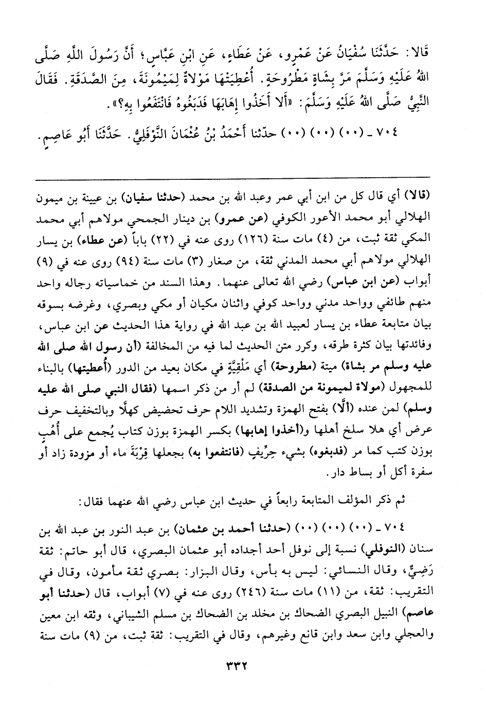 قَالا: حَدَّثَنَا سُفْيَانُ عَنْ عَمْرٍو، عَنْ عَطَاءٍ، عَنِ ابْنِ عَبَّاسِ؛ أَنَّ رَسُولَ اللهِ صَلَّى اللهُ عَلَيهِ وَسَلَّمَ مَرَّ بِشَاةٍ مَطْرُوحَةٍ. أُعْطِيَتْهَا مَوْلاةٌ لِمَيمُونَةَ، مِنَ الصَّدَقَةِ. فَقَال النَّبِي صَلَّى اللهُ عَلَيهِ وَسَلَّمَ: "أَلا أَخَذُوا إِهَابَهَا فَدَبَغُوهُ فَانْتَفَعُوا بِهِ؟ ".