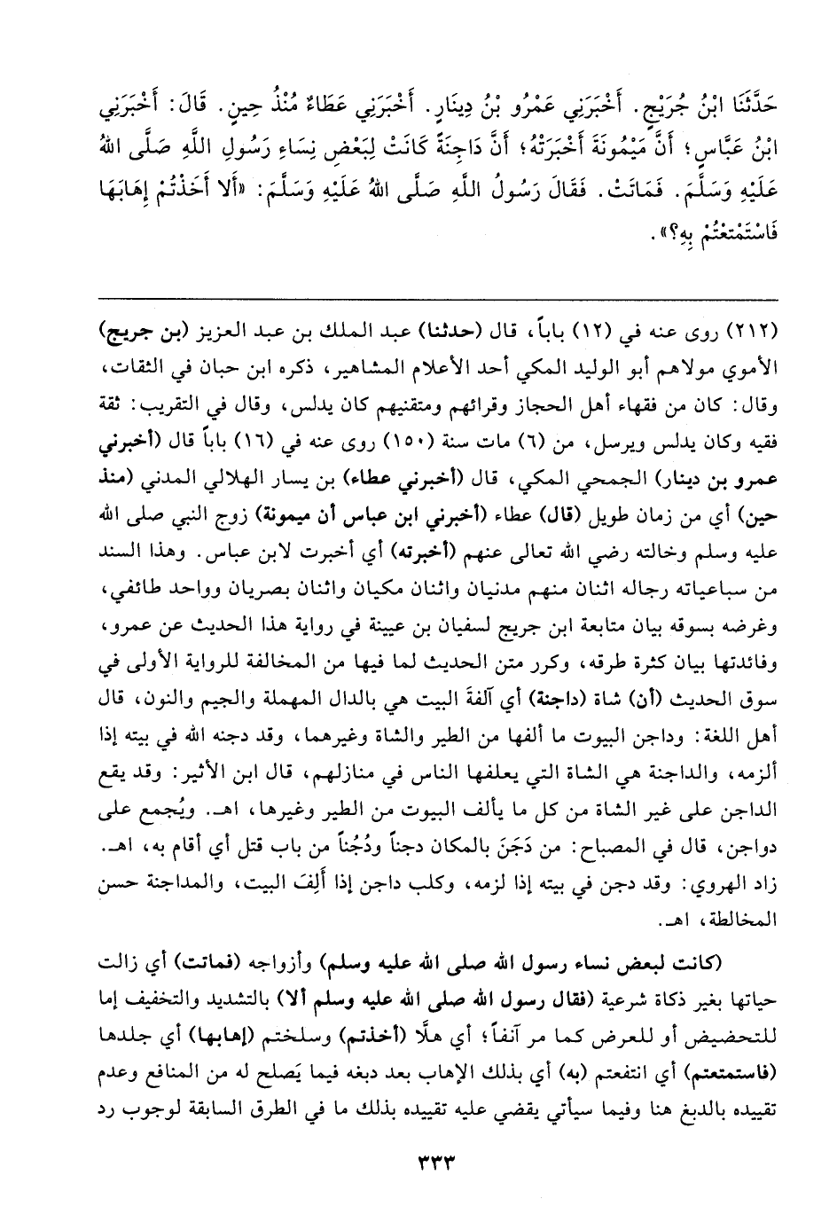 (٢١٢) روى عنه في (١٢) بابا، قال (حدثنا) عبد الملك بن عبد العزيز (بن جريج) الأموي مولاهم أبو الوليد المكي أحد الأعلام المشاهير، ذكره ابن حبان في الثقات، وقال: كان من فقهاء أهل الحجاز وقرائهم ومتقنيهم كان يدلس، وقال في التقريب: ثقة فقيه وكان يدلس ويرسل، من (٦) مات سنة (١٥٠) روى عنه في (١٦) بابا قال (أخبرني عمرو بن دينار) الجمحي المكي، قال (أخبرني عطاء) بن يسار الهلالي المدني (منذ حين) أي من زمان طويل (قال) عطاء (أخبرني ابن عباس أن ميمونة) زوج النبي صلى الله عليه وسلم وخالته رضي الله تعالى عنهم (أخبرته) أي أخبرت لابن عباس. وهذا السند من سباعياته رجاله اثنان منهم مدنيان واثنان مكيان واثنان بصريان وواحد طائفي، وغرضه بسوقه بيان متابعة ابن جريج لسفيان بن عيينة في رواية هذا الحديث عن عمرو، وفائدتها بيان كثرة طرقه، وكرر متن الحديث لما فيها من المخالفة للرواية الأولى في سوق الحديث (أن) شاة (داجنة) أي آلفةَ البيت هي بالدال المهملة والجيم والنون، قال أهل اللغة: وداجن البيوت ما ألفها من الطير والشاة وغيرهما، وقد دجنه الله في بيته إذا ألزمه، والداجنة هي الشاة التي يعلفها الناس في منازلهم، قال ابن الأثير: وقد يقع الداجن على غير الشاة من كل ما يألف البيوت من الطير وغيرها، اهـ. ويُجمع على دواجن، قال في المصباح: من دَجَنَ بالمكان دجنًا ودُجُنًا من باب قتل أي أقام به، اهـ. زاد الهروي: وقد دجن في بيته إذا لزمه، وكلب داجن إذا أَلِفَ البيت، والمداجنة حسن المخالطة، اهـ.