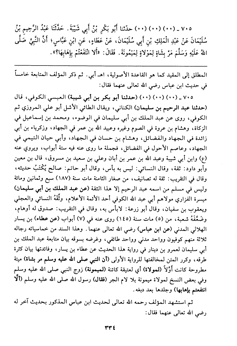 ٧٠٥ - (٠٠) (٠٠) (٠٠) حدَّثنا أَبُو بَكْرِ بْنُ أَبِي شَيبَةَ. حَدَّثنَا عَبْدُ الرَّحِيمِ بْنُ سُلَيمَانَ عَنْ عَبْدِ الْمَلِكِ بْنِ أَبِي سُلَيمَانَ، عَنْ عَطَاءٍ، عَنِ ابْنِ عَبَّاسٍ؛ أَنَّ النَّبِيَّ صَلَّى اللهُ عَلَيهِ وَسَلَّمَ مَرَّ بِشَاةٍ لِمَوْلاةٍ لِمَيمُونَةَ. فَقَال: "أَلا انْتَفَعتُمْ بِإِهَابِهَا؟ "
