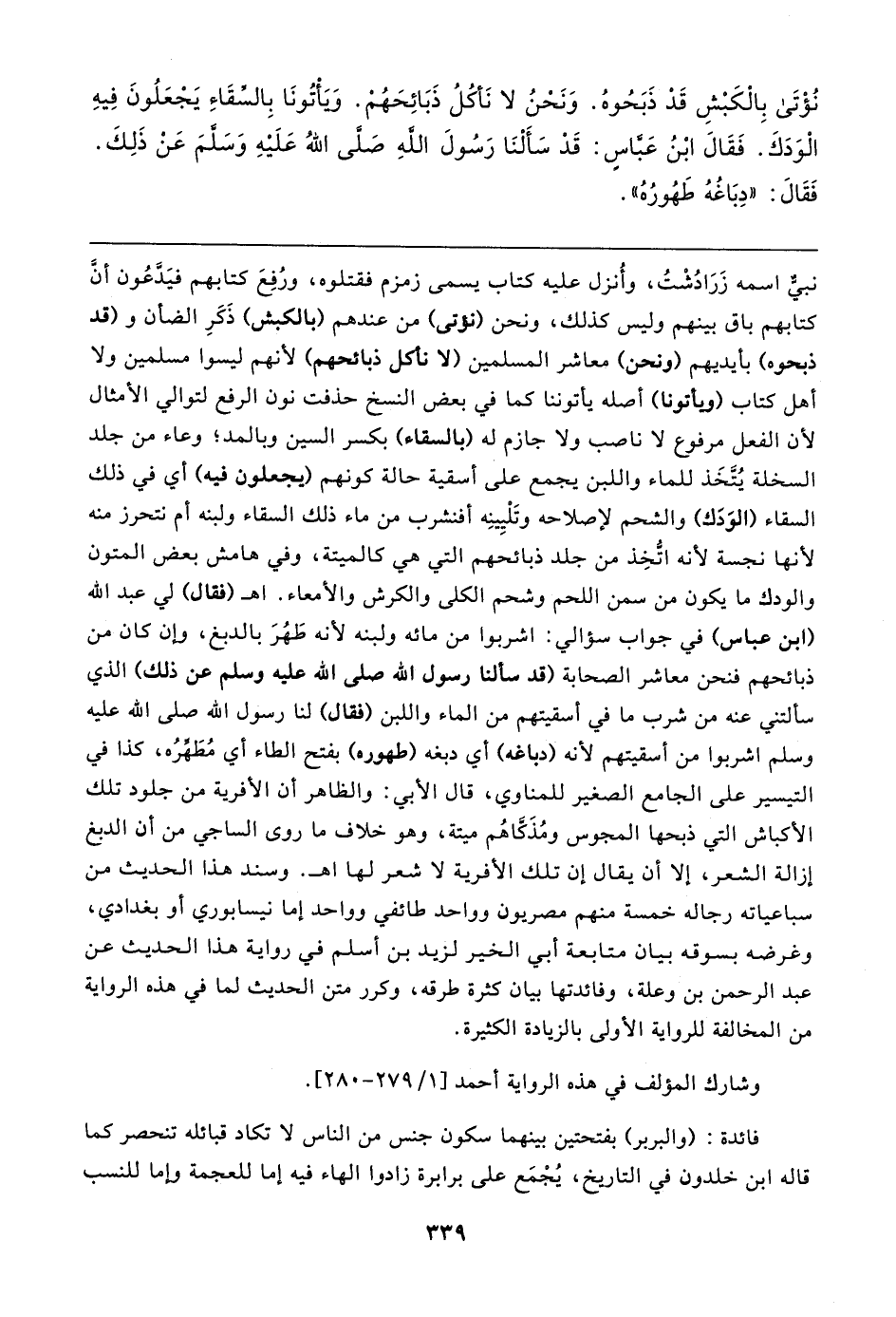 نُؤْتَى بِالْكَبْشِ قَدْ ذَبَحُوهُ. وَنَحْنُ لا نَأكُلُ ذَبَائِحَهُمْ. وَيَأْتُونَا بِالسِّقَاءِ يَجْعَلُونَ فِيهِ الْوَدَكَ. فَقَال ابْنُ عَبَّاسٍ: قَدْ سَأَلْنَا رَسُولَ اللهِ صَلَّى اللهُ عَلَيهِ وَسَلَّمَ عَنْ ذَلِكَ. فَقَال: "دِبَاغُهُ طَهُورُهُ"