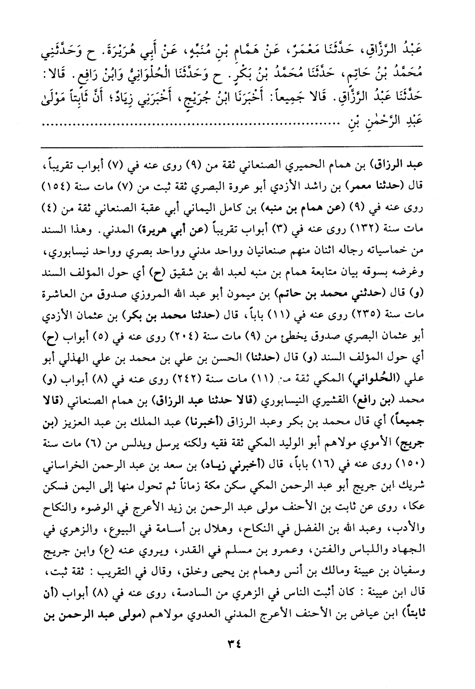 عبد الرزاق) بن همام الحميري الصنعاني ثقة من (٩) روى عنه في (٧) أبواب تقريبًا، قال (حدثنا معمر) بن راشد الأزدي أبو عروة البصري ثقة ثبت من (٧) مات سنة (١٥٤) روى عنه في (٩) (عن همام بن منبه) بن كامل اليماني أبي عقبة الصنعاني ثقة من (٤) مات سنة (١٣٢) روى عنه في (٣) أبواب تقريبًا (عن أبي هريرة) المدني. وهذا السند من خماسياته رجاله اثنان منهم صنعانيان وواحد مدني وواحد بصري وواحد نيسابوري، وغرضه بسوقه بيان متابعة همام بن منبه لعبد الله بن شقيق (ح) أي حول المؤلف السند (و) قال (حدثني محمد بن حاتم) بن ميمون أبو عبد الله المروزي صدوق من العاشرة مات سنة (٢٣٥) روى عنه في (١١) بابا، قال (حدثنا محمد بن بكر) بن عثمان الأزدي أبو عثمان البصري صدوق يخطئ من (٩) مات سنة (٢٠٤) روى عنه في (٥) أبواب (ح) أي حول المؤلف السند (و) قال (حدثنا) الحسن بن علي بن محمد بن علي الهذلي أبو علي (الحُلواني) المكي ثقة من (١١) مات سنة (٢٤٢) روى عنه في (٨) أبواب (و) محمد (بن رافع) القشيري النيسابوري (قالا حدثنا عبد الرزاق) بن همام الصنعاني (قالا جميعًا) أي قال محمد بن بكر وعبد الرزاق (أخبرنا) عبد الملك بن عبد العزيز (بن جريج) الأموي مولاهم أبو الوليد المكي ثقة فقيه ولكنه يرسل ويدلس من (٦) مات سنة (١٥٠) روى عنه في (١٦) بابا، قال (أخبرني زياد) بن سعد بن عبد الرحمن الخراساني شريك ابن جريج أبو عبد الرحمن المكي سكن مكة زمانًا ثم تحول منها إلى اليمن فسكن عكا، روى عن ثابت بن الأحنف مولى عبد الرحمن بن زيد الأعرج في الوضوء والنكاح والأدب، وعبد الله بن الفضل في النكاح، وهلال بن أسامة في البيوع، والزهري في الجهاد واللباس والفتن، وعمرو بن مسلم في القدر، ويروي عنه (ع) وابن جريج وسفيان بن عيينة ومالك بن أنس وهمام بن يحيى وخلق، وقال في التقريب: ثقة ثبت، قال ابن عيينة: كان أثبت الناس في الزهري من السادسة، روى عنه في (٨) أبواب (أن ثابتًا) ابن عياض بن الأحنف الأعرج المدني العدوي مولاهم (مولى عبد الرحمن بن