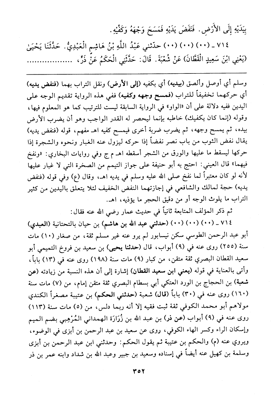 ٧١٤ - (٠٠) (٠٠) (٠٠) (حدثني عبد الله بن هاشم) بن حيان بالتحتانية (العبدي) أبو عبد الرحمن الطوسي سكن نيسابور لم يرو عنه غير مسلم ثقة، من صغار (١٠) مات سنة (٢٥٥) روى عنه في (٩) أبواب، قال (حدثنا يحيى) بن سعيد بن فروخ التميمي أبو سعيد القطان البصري ثقة متقن، من كبار (٩) مات سنة (١٩٨) روى عنه في (١٣) بابا، وأتى بالعناية في قوله (يعني ابن سعيد القطان) إشارة إلى أن هذه النسبة من زيادته (عن شعبة) بن الحجاج بن الورد العتكي أبي بسطام البصري ثقة متقن إمام، من (٧) مات سنة (١٦٠) روى عنه في (٣٠) بابا (قال) شعبة (حدثني الحكم) بن عتيبة مصغرًا الكندي مولاهم أبو محمد الكوفي ثقة ثبت فقيه إلَّا أنه ربما دلس، من (٥) مات سنة (١١٣) روى عنه في (٩) أبواب (عن ذر) بن عبد الله بن زُرَارَة الهمداني المُرْهِبي بضم الميم وإسكان الراء وكسر الهاء الكوفي، روى عن سعيد بن عبد الرحمن بن أبزى في الوضوء، ويروي عنه (م) والحكم بن عتيبة ثم يقول الحكم: وحدثني ابن عبد الرحمن بن أبزى وسلمة بن كهيل عنه أيضًا في إسناده وسعيد بن جبير وعبد الله بن شداد وابنه عمر بن ذر