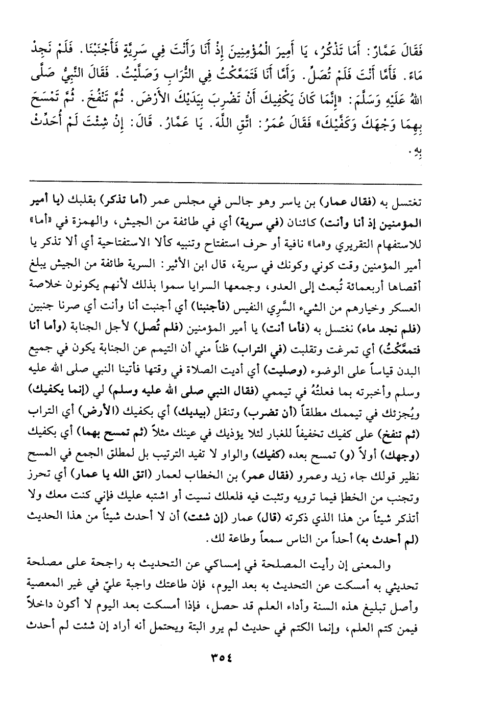 فَقَال عَمَّارٌ: أَمَا تَذْكُرُ، يَا أَمِيرَ الْمُؤْمِنِينَ إِذْ أَنَا وَأَنْتَ فِي سَرِيَّةٍ فَأَجنَبْنَا. فَلَمْ نَجِدْ مَاءً. فَأَمَّا أَنْتَ فَلَمْ تُصَلِّ. وَأَمَّا أَنَا فَتَمَعَّكْتُ فِي التُّرَابِ وَصَلَّيتُ. فَقَال النَّبِيُّ صَلَّى اللهُ عَلَيهِ وَسَلَّمَ: "إِنَّمَا كَانَ يَكْفِيكَ أَنْ تَضْرِبَ بِيَدَيكَ الأَرْضَ. ثُمَّ تَنْفُخَ. ثُمَّ تَمْسَحَ بِهِمَا وَجْهَكَ وَكَفَّيكَ" فَقَال عُمَرُ: اتَّقِ اللهَ. يَا عَمَّارُ. قَال: إِنْ شِئْتَ لَمْ أُحَدِّثْ بِهِ