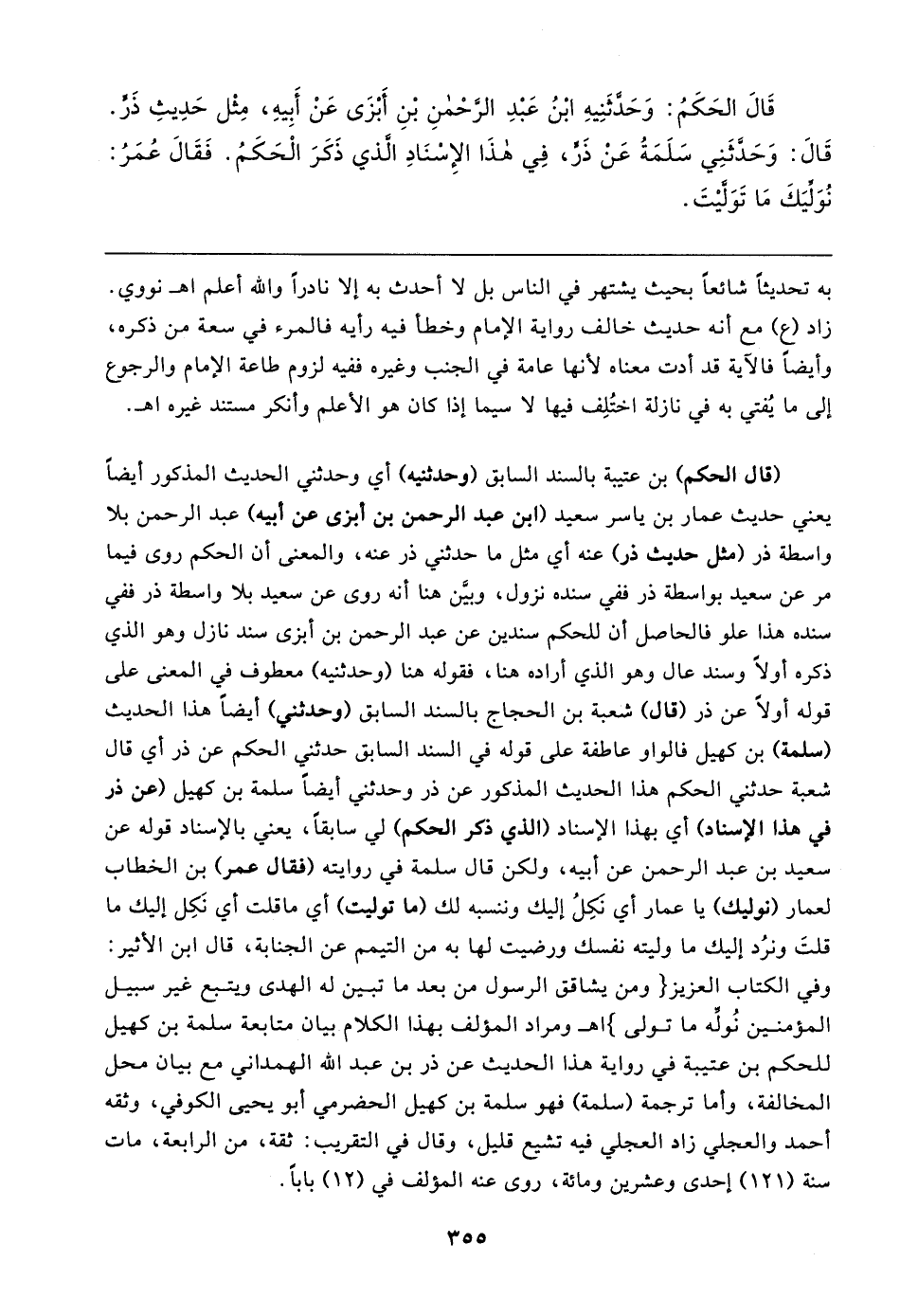 (قال الحكم) بن عتيبة بالسند السابق (وحدثنيه) أي وحدثني الحديث المذكور أيضًا يعني حديث عمار بن ياسر سعيد (ابن عبد الرحمن بن أبزى عن أبيه) عبد الرحمن بلا واسطة ذر (مثل حديث ذر) عنه أي مثل ما حدثني ذر عنه، والمعنى أن الحكم روى فيما مر عن سعيد بواسطة ذر ففي سنده نزول، وبيَّن هنا أنه روى عن سعيد بلا واسطة ذر ففي سنده هذا علو فالحاصل أن للحكم سندين عن عبد الرحمن بن أبزى سند نازل وهو الذي ذكره أولًا وسند عال وهو الذي أراده هنا، فقوله هنا (وحدثنيه) معطوف في المعنى على قوله أولًا عن ذر (قال) شعبة بن الحجاج بالسند السابق (وحدثني) أيضًا هذا الحديث (سلمة) بن كهيل فالواو عاطفة على قوله في السند السابق حدثني الحكم عن ذر أي قال شعبة حدثني الحكم هذا الحديث المذكور عن ذر وحدثني أيضًا سلمة بن كهيل (عن ذر في هذا الإسناد) أي بهذا الإسناد (الذي ذكر الحكم) لي سابقًا، يعني بالإسناد قوله عن سعيد بن عبد الرحمن عن أبيه، ولكن قال سلمة في روايته (فقال عمر) بن الخطاب لعمار (نوليك) يا عمار أي نَكِلُ إليك وننسبه لك (ما توليت) أي ما قلت أي نَكِل إليك ما قلتَ ونرُد إليك ما وليته نفسك ورضيت لها به من التيمم عن الجنابة، قال ابن الأثير: وفي الكتاب العزيز {وَمَنْ يُشَاقِقِ الرَّسُولَ مِنْ بَعْدِ مَا تَبَيَّنَ لَهُ الْهُدَى وَيَتَّبِعْ غَيرَ سَبِيلِ الْمُؤْمِنِينَ نُوَلِّهِ مَا تَوَلَّى} اهـ ومراد المؤلف بهذا الكلام بيان متابعة سلمة بن كهيل للحكم بن عتيبة في رواية هذا الحديث عن ذر بن عبد الله الهمداني مع بيان محل المخالفة، وأما ترجمة (سلمة) فهو سلمة بن كهيل الحضرمي أبو يحيى الكوفي، وثقه أحمد والعجلي زاد العجلي فيه تشيع قليل، وقال في التقريب: ثقة، من الرابعة، مات سنة (١٢١) إحدى وعشرين ومائة، روى عنه المؤلف في (١٢) بابا.