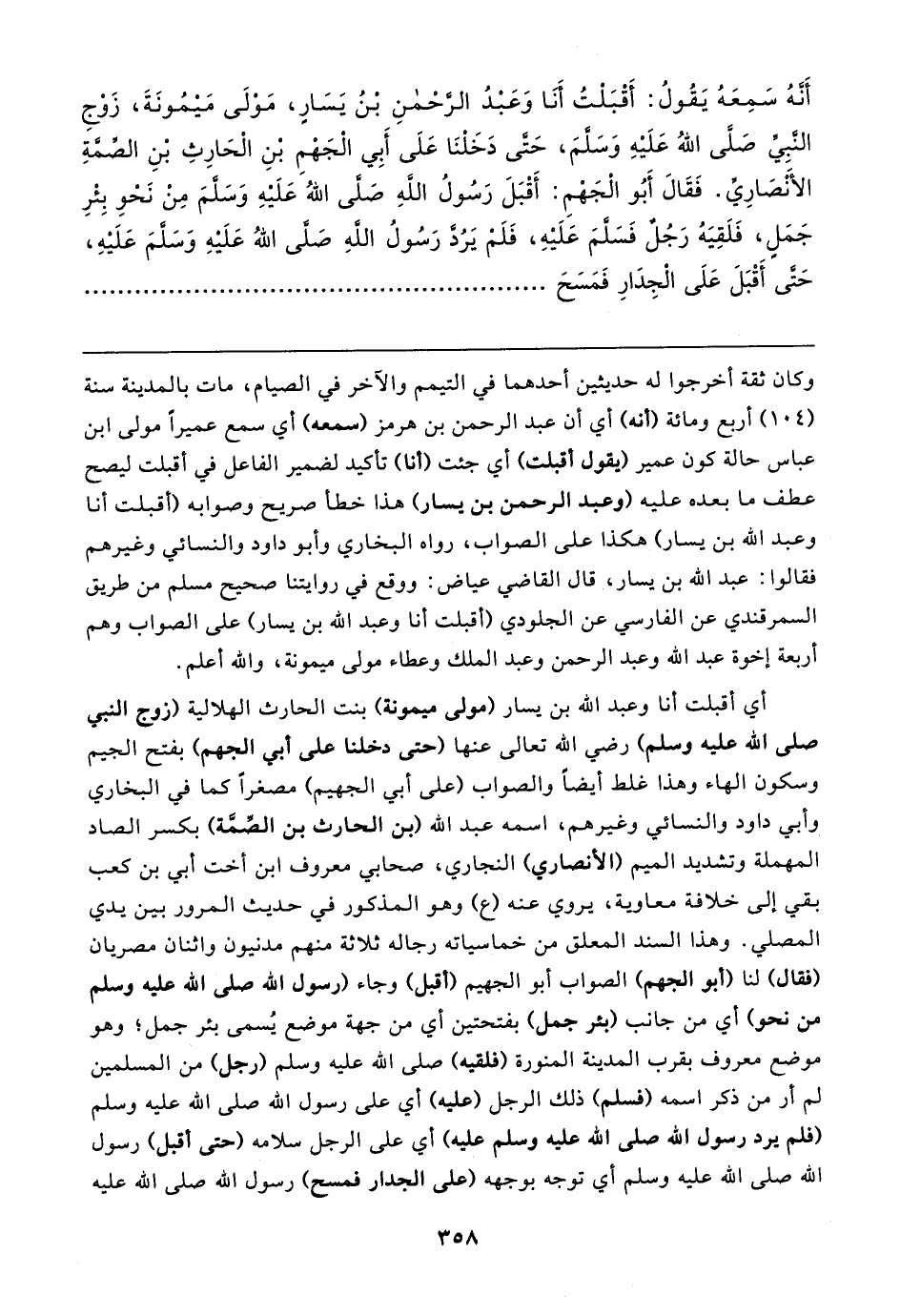أي أقبلت أنا وعبد الله بن يسار (مولى ميمونة) بنت الحارث الهلالية (زوج النبي صلى الله عليه وسلم) رضي الله تعالى عنها (حتى دخلنا على أبي الجهم) بفتح الجيم وسكون الهاء وهذا غلط أيضًا والصواب (على أبي الجهيم (مصغرًا كما في البخاري وأبي داود والنسائي وغيرهم، اسمه عبد الله (بن الحارث بن الصِّمَّة) بكسر الصاد المهملة وتشديد الميم (الأنصاري) النجاري، صحابي معروف ابن أخت أبي بن كعب بقي إلى خلافة معاوية، يروي عنه (ع) وهو المذكور في حديث المرور بين يدي المصلي. وهذا السند المعلق من خماسياته رجاله ثلاثة منهم مدنيون واثنان مصريان (فقال) لنا (أبوالجهم) الصواب أبوالجهيم (أقبل) وجاء (رسول الله صلى الله عليه وسلم من نحو) أي من جانب (بئر جمل) بفتحتين أي من جهة موضع يُسمى بئر جمل؛ وهو موضع معروف بقرب المدينة المنورة (فلقيه) صلى الله عليه وسلم (رجل) من المسلمين لم أر من ذكر اسمه (فسلم) ذلك الرجل (عليه) أي على رسول الله صلى الله عليه وسلم (فلم يرد رسول الله صلى الله عليه وسلم عليه) أي على الرجل سلامه (حتى أقبل) رسول الله صلى الله عليه وسلم أي توجه بوجهه (على الجدار فمسح) رسول الله صلى الله عليه
