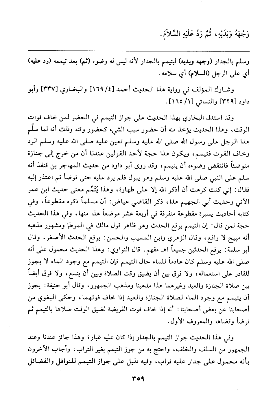 وقد استدل البخاري بهذا الحديث على جواز التيمم في الحضر لمن خاف فوات الوقت، وهذا الحديث يؤخذ منه أن حضور سبب الشيء كحضور وقته وذلك أنه لما سلَّم هذا الرجل على رسول الله صلى الله عليه وسلم تعين عليه صلى الله عليه وسلم الرد وخاف الفوت فتيمم، ويكون هذا حجة لأحد القولين عندنا أن من خرج إلى جنازة متوضئًا فانتقض وضوءه أن يتيمم، وقد روى أبو داود من حديث المهاجر بن قنفذ أنه سلم على النبي صلى الله عليه وسلم وهو يبول فلم يرد عليه حتى توضأ ثم اعتذر إليه فقال: إني كنت كرهت أن أذكر الله إلَّا على طهارة، وهذا يُتَمِّم معنى حديث ابن عمر الآتي وحديث أبي الجهيم هذا، ذكر القاضي عياض: أن مسلمًا ذكره مقطوعًا، وفي كتابه أحاديث يسيرة مقطوعة متفرقة في أربعة عشر موضعًا هذا منها، وفي هذا الحديث حجة لمن قال: إن التيمم يرفع الحدث وهو ظاهر قول مالك في الموطأ ومشهور مذهبه أنه مبيح لا رافع، وقال الزهري وابن المسيب والحسن: يرفع الحدث الأصغر، وقال أبو سلمة: يرفع الحدثين جميعًا اهـ مفهم. قال النواوي: وهذا الحديث محمول على أنه صلى الله عليه وسلم كان عادمًا للماء حال التيمم فإن التيمم مع وجود الماء لا يجوز للقادر على استعماله، ولا فرق بين أن يضيق وقت الصلاة وبين أن يتسع، ولا فرق أيضًا بين صلاة الجنازة والعيد وغيرهما هذا مذهبنا ومذهب الجمهور، وقال أبو حنيفة: يجوز أن يتيمم مع وجود الماء لصلاة الجنازة والعيد إذا خاف فوتهما، وحكى البغوي من أصحابنا عن بعض أصحابنا: أنه إذا خاف فوت الفريضة لضيق الوقت صلاها بالتيمم ثم توضأ وقضاها والمعروف الأول.