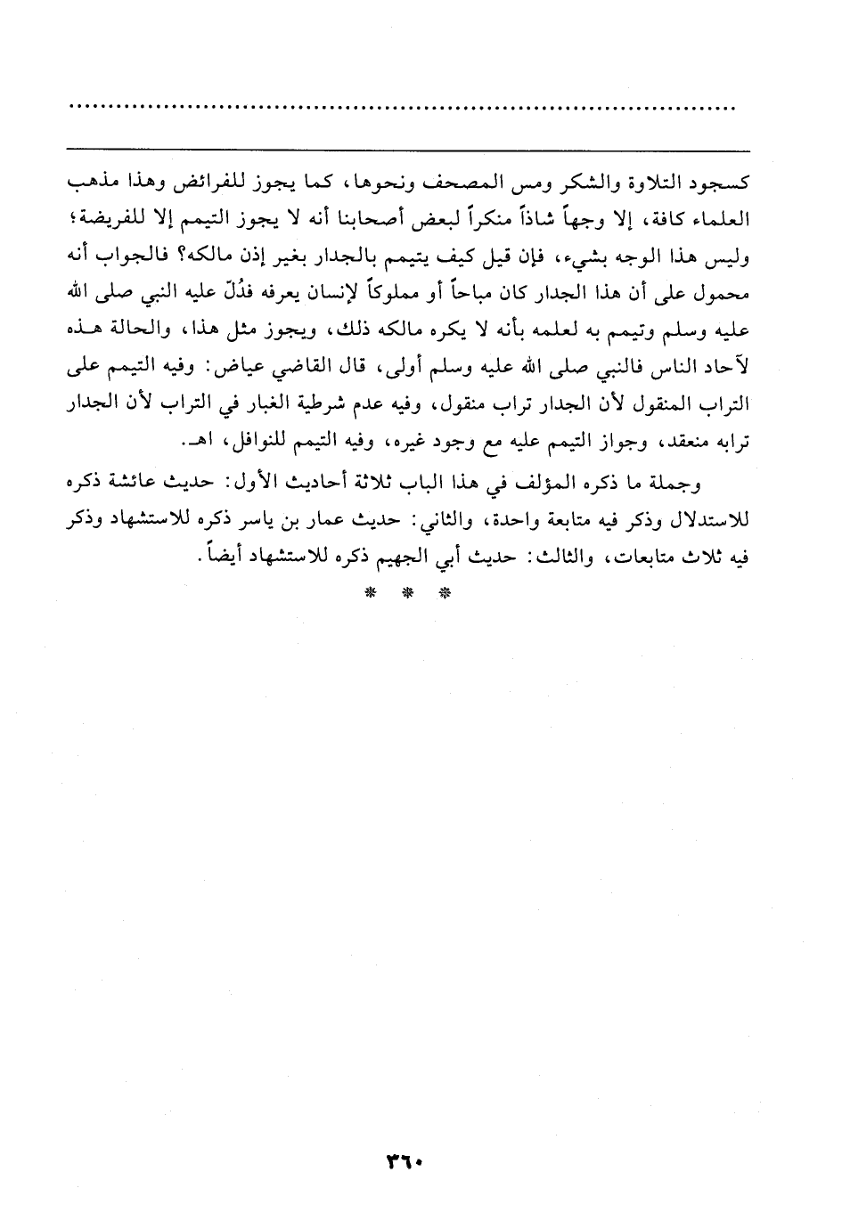 كسجود التلاوة والشكر ومس المصحف ونحوها، كما يجوز للفرائض وهذا مذهب العلماء كافة، إلَّا وجهًا شاذًّا منكرًا لبعض أصحابنا أنه لا يجوز التيمم إلَّا للفريضة؛ وليس هذا الوجه بشيء، فإن قيل كيف يتيمم بالجدار بغير إذن مالكه؟ فالجواب أنه محمول على أن هذا الجدار كان مباحًا أو مملوكًا لإنسان يعرفه فدُلّ عليه النبي صلى الله عليه وسلم وتيمم به لعلمه بأنه لا يكره مالكه ذلك، ويجوز مثل هذا، والحالة هذه لآحاد الناس فالنبي صلى الله عليه وسلم أولى، قال القاضي عياض: وفيه التيمم على التراب المنقول لأن الجدار تراب منقول، وفيه عدم شرطية الغبار في التراب لأن الجدار ترابه منعقد، وجواز التيمم عليه مع وجود غيره، وفيه التيمم للنوافل، اهـ.