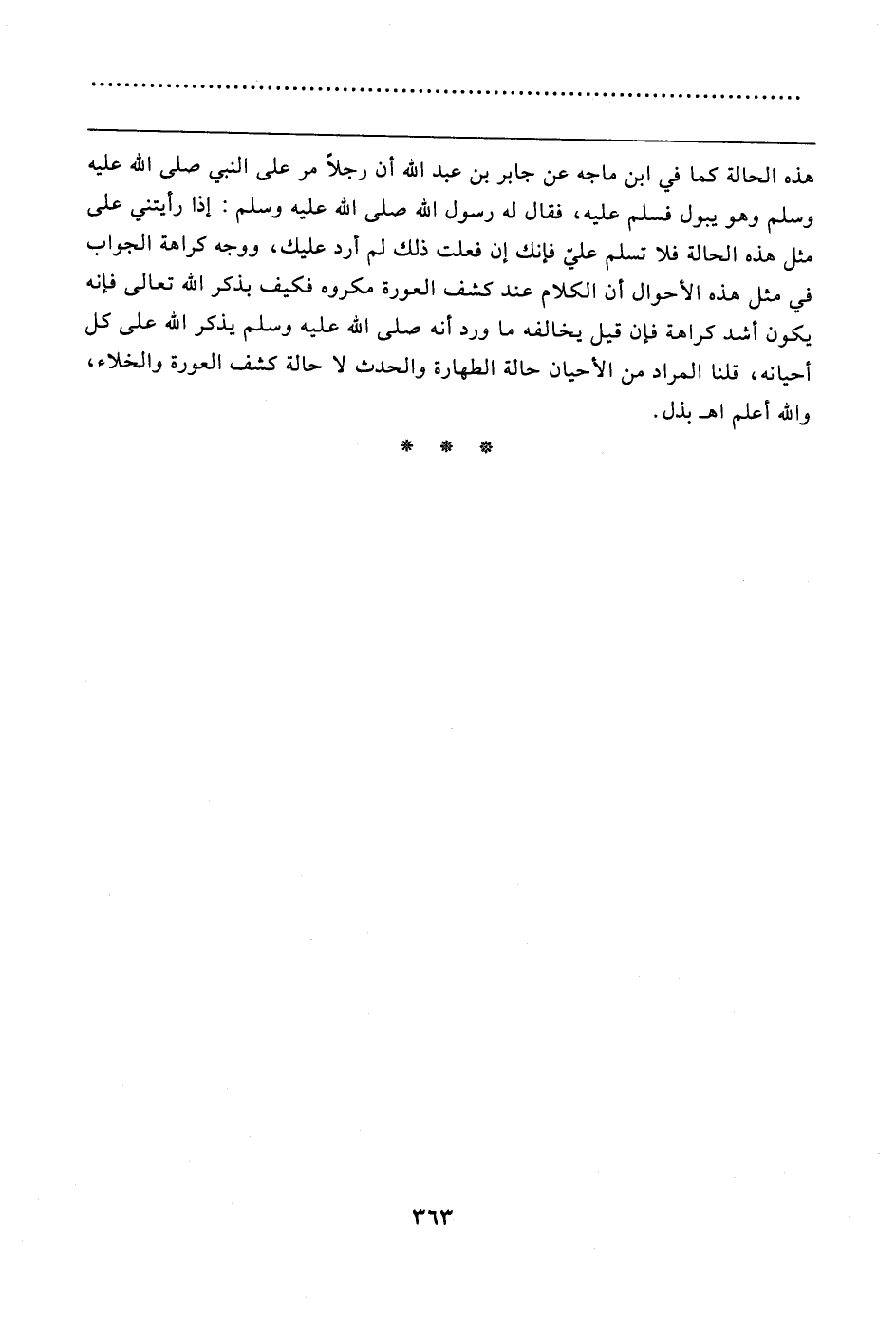 هذه الحالة كما في ابن ماجه عن جابر بن عبد الله أن رجلًا مر على النبي صلى الله عليه وسلم وهو يبول فسلم عليه، فقال له رسول الله صلى الله عليه وسلم: إذا رأيتني على مثل هذه الحالة فلا تسلم عليّ فإنك إن فعلت ذلك لم أرد عليك، ووجه كراهة الجواب في مثل هذه الأحوال أن الكلام عند كشف العورة مكروه فكيف بذكر الله تعالى فإنه يكون أشد كراهة فإن قيل يخالفه ما ورد أنه صلى الله عليه وسلم يذكر الله على كل أحيانه، قلنا المراد من الأحيان حالة الطهارة والحدث لا حالة كشف العورة والخلاء، والله أعلم اهـ بذل.
