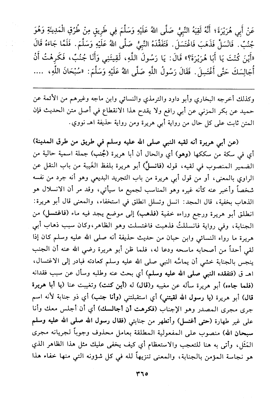 عَنْ أَبِي هُرَيرَةَ؛ أَنَّهُ لَقِيَهُ النَّبِيُّ صَلَّى اللهُ عَلَيهِ وَسَلَّمَ فِي طَرِيقٍ مِنْ طُرُقِ الْمَدِينَةِ وَهُوَ جُنُبٌ. فَانْسَلَّ فَذَهَبَ فَاغتَسَلَ. فَتَفَقَّدَهُ النَّبِيُّ صَلَّى اللهُ عَلَيهِ وَسَلَّمَ. فَلَمَّا جَاءَهُ قَال "أَينَ كُنْتَ يَا أَبَا هُرَيرَةَ؟ " قَال: يَا رَسُولَ اللهِ، لَقِيتَنِي وَأَنَا جُنُبٌ، فَكَرِهْتُ أَنْ أُجَالِسَكَ حَتَّى أَغْتَسِلَ. فَقَال رَسُولُ اللهِ صَلَّى اللهُ عَلَيهِ وَسَلَّمَ: "سُبْحَانَ اللهِ،