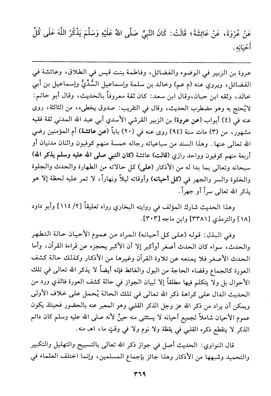 عَنْ عُرْوَةَ، عَنْ عَائِشَةَ؛ قَالتْ: كَانَ النَّبِيُّ صَلَّى اللهُ عَلَيهِ وَسَلَّمَ يَذْكُرُ اللهَ عَلَى كُلِّ أَحْيَانِهِ