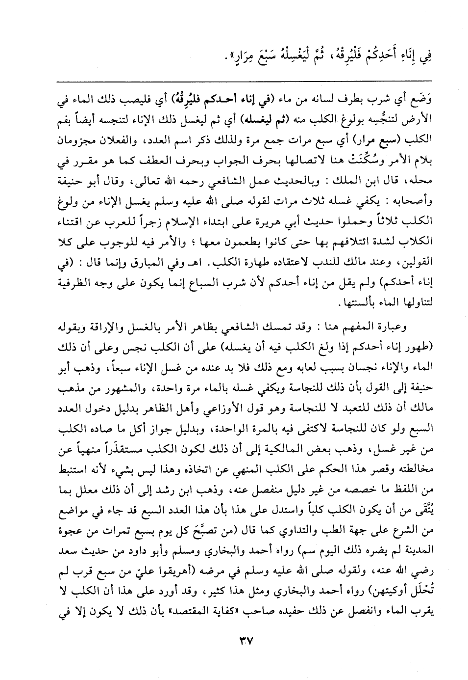 وعبارة المفهم هنا: وقد تمسك الشافعي بظاهر الأمر بالغسل والإراقة وبقوله (طهور إناء أحدكم إذا ولغ الكلب فيه أن يغسله) على أن الكلب نجس وعلى أن ذلك الماء والإناء نجسان بسبب لعابه ومع ذلك فلا بد عنده من غسل الإناء سبعًا، وذهب أبو حنيفة إلى القول بأن ذلك للنجاسة ويكفي غسله بالماء مرة واحدة، والمشهور من مذهب مالك أن ذلك للتعبد لا للنجاسة وهو قول الأوزاعي وأهل الظاهر بدليل دخول العدد السبع ولو كان للنجاسة لاكتفى فيه بالمرة الواحدة، وبدليل جواز أكل ما صاده الكلب من غير غسل، وذهب بعض المالكية إلى أن ذلك لكون الكلب مستقذَرًا منهيًا عن مخالطته وقصر هذا الحكم على الكلب المنهي عن اتخاذه وهذا ليس بشيء لأنه استنبط من اللفظ ما خصصه من غير دليل منفصل عنه، وذهب ابن رشد إلى أن ذلك معلل بما يُتَّقَى من أن يكون الكلب كلبًا واستدل على هذا بأن هذا العدد السبع قد جاء في مواضع من الشرع على جهة الطب والتداوي كما قال (من تصبَّحَ كل يوم بسبع تمرات من عجوة المدينة لم يضره ذلك اليوم سم) رواه أحمد والبخاري ومسلم وأبو داود من حديث سعد رضي الله عنه، ولقوله صلى الله عليه وسلم في مرضه (أهريقوا عليّ من سبع قرب لم تُحْلَل أوكيتهن) رواه أحمد والبخاري ومثل هذا كثير، وقد أورد على هذا أن الكلب لا يقرب الماء وانفصل عن ذلك حفيده صاحب "كفاية المقتصد" بأن ذلك لا يكون إلا في