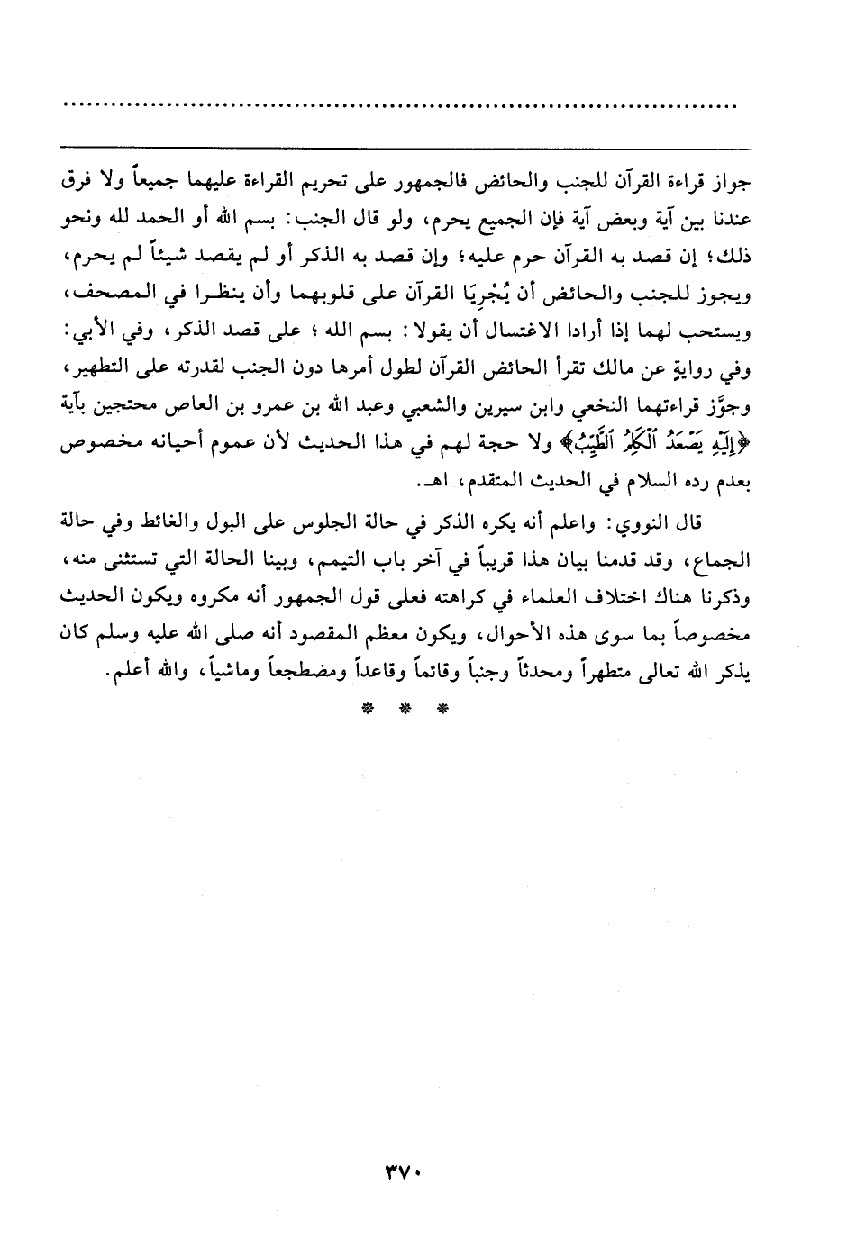 قال النووي: واعلم أنه يكره الذكر في حالة الجلوس على البول والغائط وفي حالة الجماع، وقد قدمنا بيان هذا قريبًا في آخر باب التيمم، وبينا الحالة التي تستثنى منه، وذكرنا هناك اختلاف العلماء في كراهته فعلى قول الجمهور أنه مكروه ويكون الحديث مخصوصًا بما سوى هذه الأحوال، ويكون معظم المقصود أنه صلى الله عليه وسلم كان يذكر الله تعالى متطهرًا ومحدثًا وجنبًا وقائمًا وقاعدًا ومضطجعًا وماشيًا، والله أعلم.