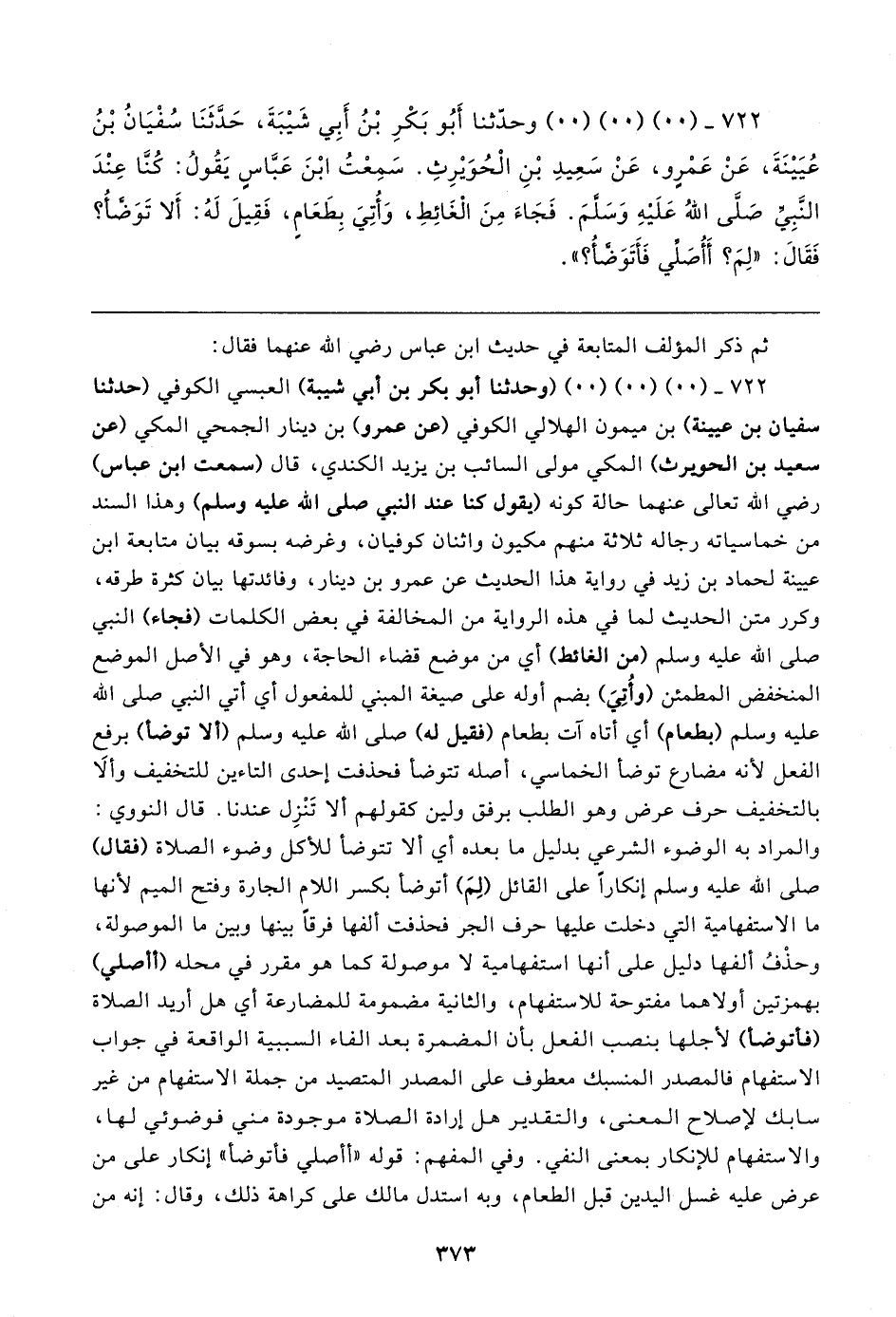 ٧٢٢ - (٠٠) (٠٠) (٠٠) وحدَّثنا أَبُو بَكْرِ بْنُ أَبِي شَيبَةَ، حَدَّثَنَا سُفْيَانُ بْنُ عُيَينَةَ، عَنْ عَمْرٍو، عَنْ سَعِيدِ بْنِ الْحُوَيرِثِ. سَمِعْتُ ابْنَ عَبَّاسٍ يَقُولُ: كُنَّا عِنْدَ النَّبِيَّ صَلَّى اللهُ عَلَيهِ وَسَلَّمَ. فَجَاءَ مِنَ الْغَائِطِ، وَأُتِيَ بِطَعَامِ، فَقِيلَ لَهُ: أَلا تَوَضَّأُ؟ فَقَال: "لِمَ؟ أَأُصَلِّي فَأَتَوَضَّأُ؟ "