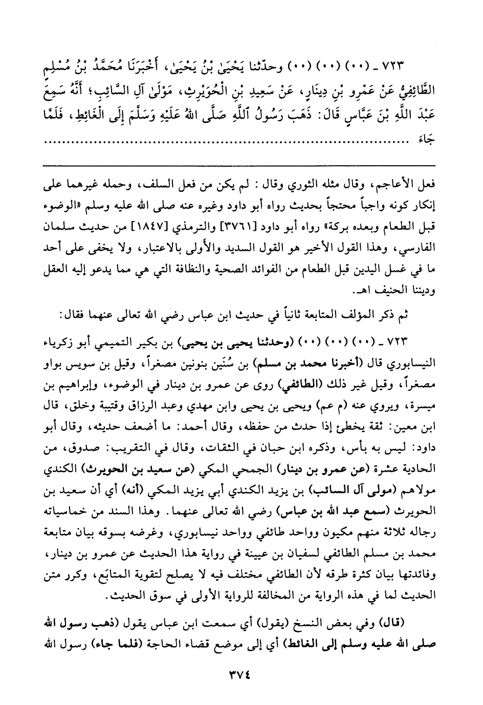 ٧٢٣ - (٠٠) (٠٠) (٠٠) وحدَّثنا يَحْيَى بْنُ يَحْيَى، أَخْبَرَنَا مُحَمَّدُ بْنُ مُسْلِمٍ الطَّائِفِيُّ عَنْ عَمْرِو بْنِ دِينَارٍ، عَنْ سَعِيدِ بْنِ الْحُوَيرِثِ، مَوْلَى آلِ السَّائِبِ؛ أَنَّهُ سَمِعَ عَبْدَ اللهِ بْنَ عَبَّاسٍ قَال: ذَهَبَ رَسُولُ اللهِ صَلَّى اللهُ عَلَيهِ وَسَلَّمَ إِلَى الْغَائِطِ، فَلَمَّا جَاءَ