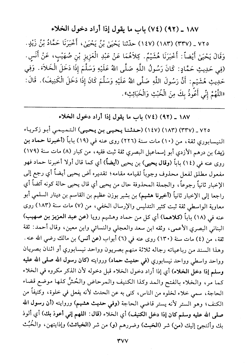 ٧٢٥ - (٣٣٧) (١٨٣) (١٤٧) حدَّثنا يَحْيَى بْنُ يَحْيَى، أَخْبَرَنَا حَمَّادُ بْنُ زَيدٍ. وَقَال يَحْيَى أَيضًا: أَخْبَرَنَا هُشَيمٌ. كِلاهُمَا عَنْ عَبْدِ الْعَزِيزِ بْنِ صُهَيبٍ، عَنْ أَنَسٍ. (فِي حَدِيثِ حَمَّادٍ: كَانَ رَسُولُ اللهِ صَلَّى اللهُ عَلَيهِ وَسَلَّمَ إِذَا دَخَلَ الْخَلاءَ. وَفِي حَدِيثِ هُشَيمٍ: أَنَّ رَسُولَ اللهِ صَلَّى اللهُ عَلَيهِ وَسَلَّمَ كَانَ إِذَا دَخَلَ الْكَنِيفَ). قَال: "اللَّهُمَّ إِنِّي أَعُوذُ بِكَ مِنَ الْخُبْثِ وَالْخَبَائِثِ"