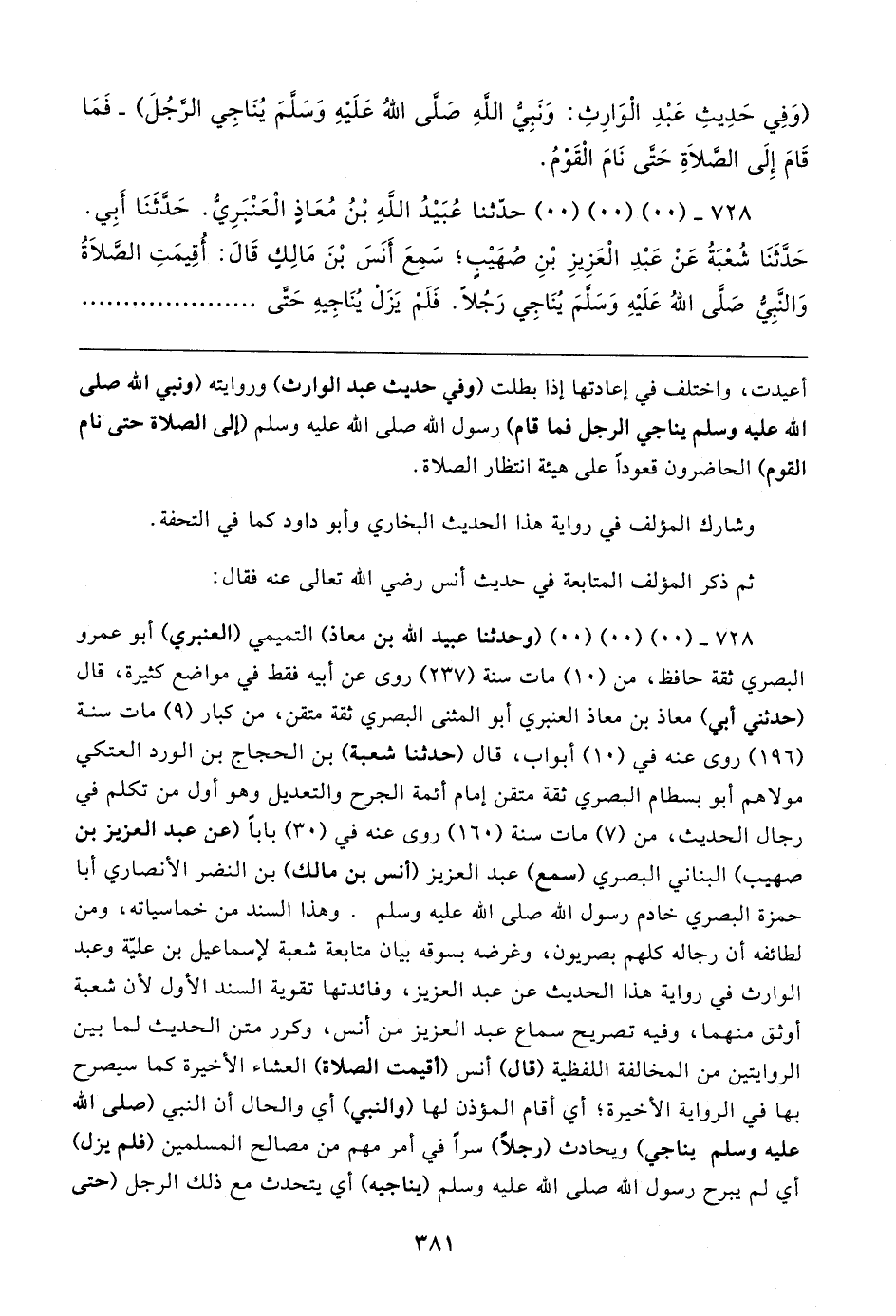 ٧٢٨ - (٠٠) (٠٠) (٠٠) (وحدثنا عببد الله بن معاذ) التميمي (العنبري) أبو عمرو البصري ثقة حافظ، من (١٠) مات سنة (٢٣٧) روى عن أبيه فقط في مواضع كثيرة، قال (حدثني أبي) معاذ بن معاذ العنبري أبو المثنى البصري ثقة متقن، من كبار (٩) مات سنة (١٩٦) روى عنه في (١٠) أبواب، قال (حدثنا شعبة) بن الحجاج بن الورد العتكي مولاهم أبو بسطام الضري ثقة متقن إمام أئمة الجرح والتعديل وهو أول من تكلم في رجال الحديث، من (٧) مات سنة (١٦٠) روى عنه في (٣٠) بابا (عن عبد العزيز بن صهيب) البناني البصري (سمع) عبد العزيز (أنس بن مالك) بن النضر الأنصاري أبا حمزة البصري خادم رسول الله صلى الله عليه وسلم. وهذا السند من خماسياته، ومن لطائفه أن رجاله كلهم بصريون، وغرضه بسوقه بيان متابعة شعبة لإسماعيل بن علية وعبد الوارث في رواية هذا الحديث عن عبد العزيز، وفائدتها تقوية السند الأول لأن شعبة أوثق منهما، وفيه تصريح سماع عبد العزيز من أنس، وكرر متن الحديث لما بين الروايتين من المخالفة اللفظية (قال) أنس (أقيمت الصلاة) العشاء الأخيرة كما سيصرح بها في الرواية الأخيرة؛ أي أقام المؤذن لها (والنبي) أي والحال أن النبي (صلى الله عليه وسلم يناجي) ويحادث (رجلًا) سرًّا في أمر مهم من مصالح المسلمين (فلم يزل) أي لم يبرح رسول الله صلى الله عليه وسلم (يناجيه) أي يتحدث مع ذلك الرجل (حتى