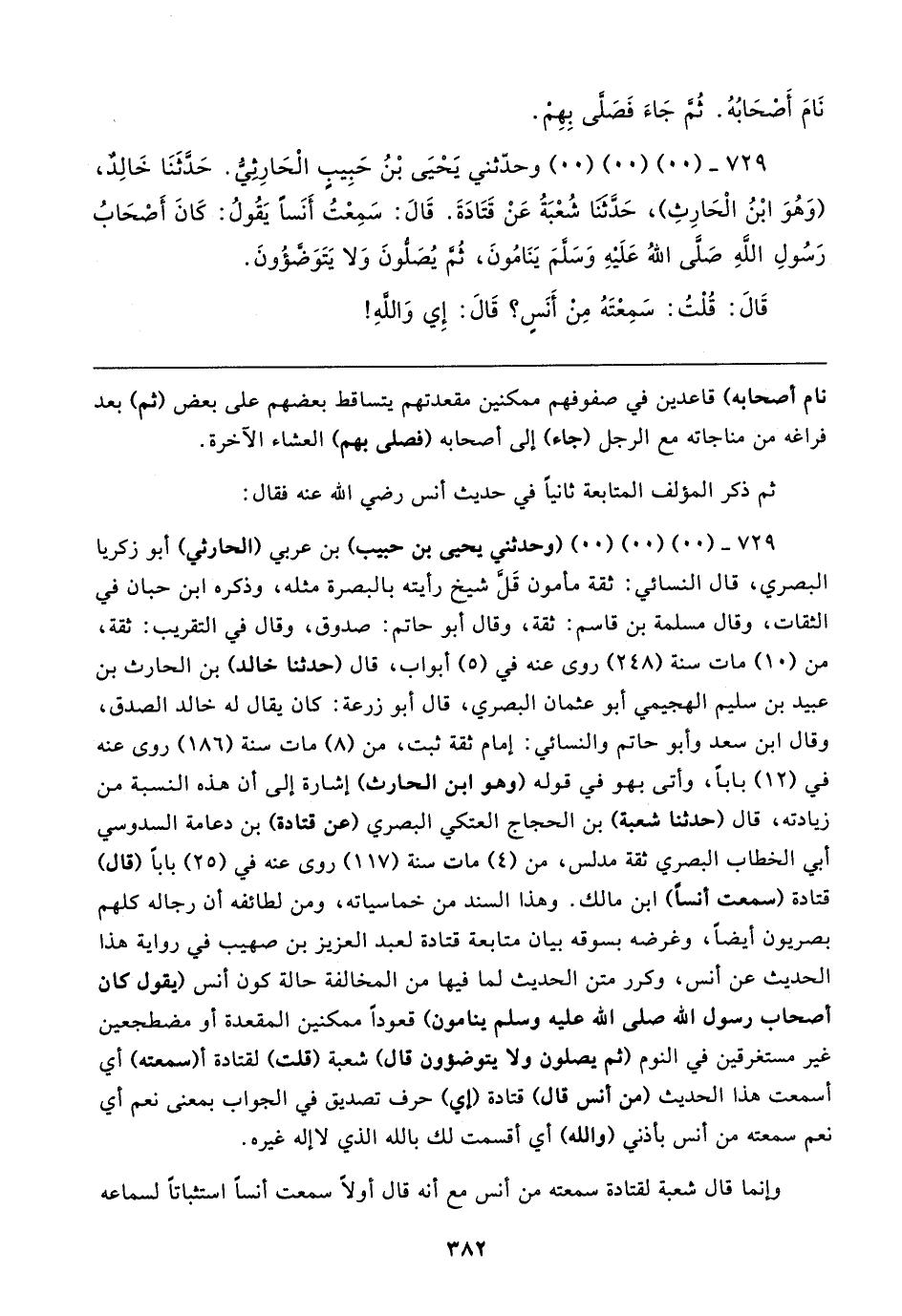 ٧٢٩ - (٠٠) (٠٠) (٠٠) وحدّثني يَحْيَى بْنُ حَبِيبٍ الْحَارِثيُّ. حَدَّثَنَا خَالِدٌ، (وَهُوَ ابْنُ الْحَارِثِ)، حَدَّثنَا شُعْبَةُ عَنْ قَتَادَةَ. قَال: سَمِعْتُ أَنَسًا يَقُولُ: كَانَ أَصْحَابُ رَسُولِ اللَّهِ - صلى الله عليه وسلم - يَنَامُونَ، ثُم يُصَلُّونَ وَلا يَتَوَضَّؤُونَ.