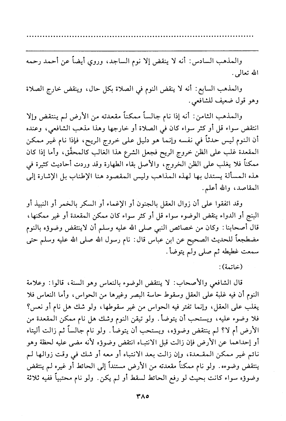 والمذهب الثامن: أنه إذا نام جالسًا ممكنًا مقعدته من الأرض لم ينتقض وإلا انتقض سواء قل أو كثر سواء كان في الصلاة أو خارجها وهذا مذهب الشافعي، وعنده أن النوم ليس حدثًا في نفسه وإنما هو دليل على خروج الريح، فإذا نام غير ممكن المقعدة غلب على الظن خروج الريح فجعل الشرع هذا الغالب كالمحقَّق، وأما إذا كان ممكنًا فلا يغلب على الظن الخروج، والأصل بقاء الطهارة وقد وردت أحاديث كثيرة في هذه المسألة يستدل بها لهذه المذاهب وليس المقصود هنا الإطناب بل الإشارة إلى المقاصد، والله أعلم.