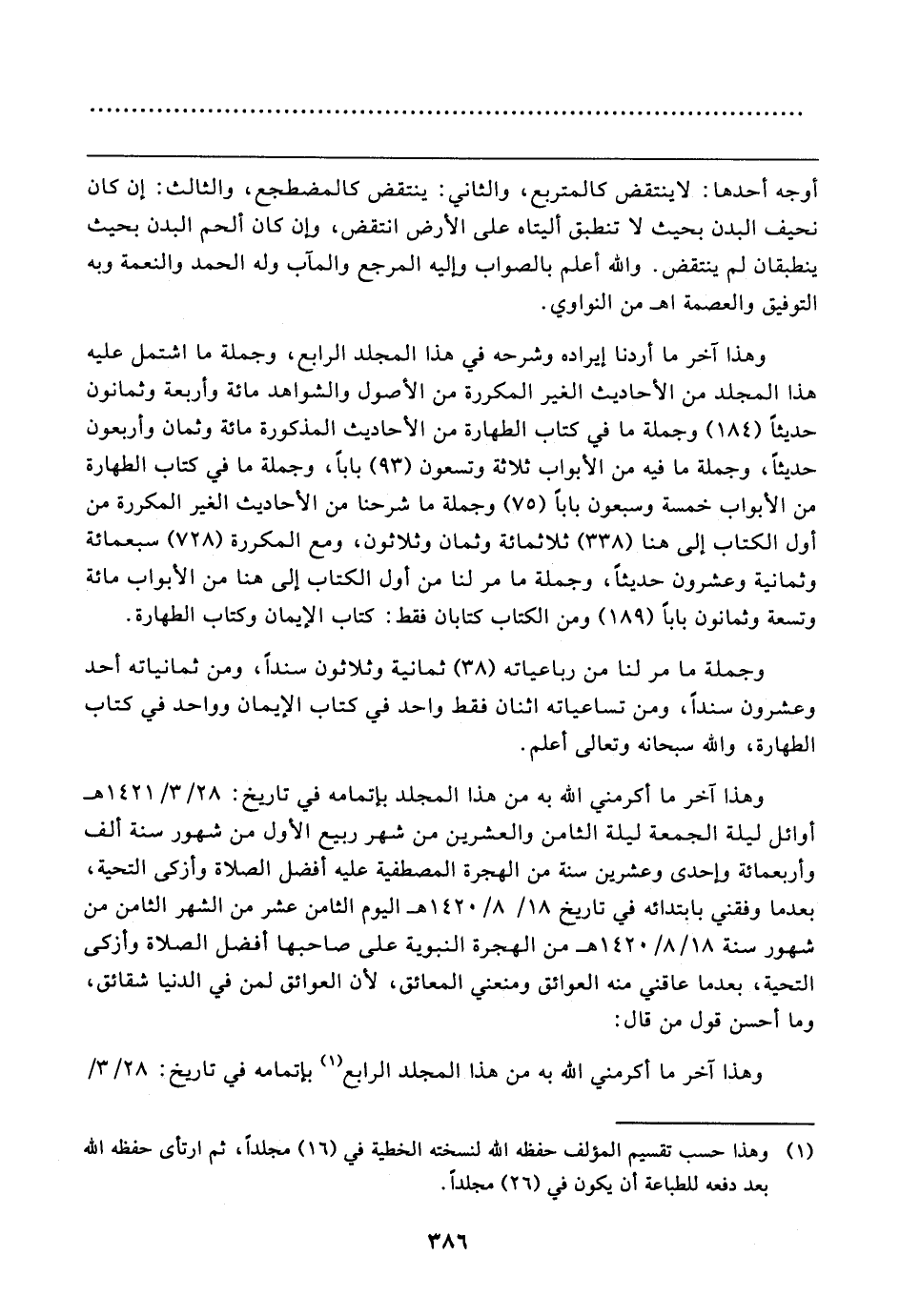 وهذا آخر ما أردنا إيراده وشرحه في هذا المجلد الرابع، وجملة ما اشتمل عليه هذا المجلد من الأحاديث الغير المكررة من الأصول والشواهد مائة وأربعة وثمانون حديثًا (١٨٤) وجملة ما في كتاب الطهارة من الأحاديث المذكورة مائة وثمان وأربعون حديثًا، وجملة ما فيه من الأبواب ثلاثة وتسعون (٩٣) بابا، وجملة ما في كتاب الطهارة من الأبواب خمسة وسبعون بابا (٧٥) وجملة ما شرحنا من الأحاديث الغير المكررة من أول الكتاب إلى هنا (٣٣٨) ثلاثمائة وثمان وثلاثون، ومع المكررة (٧٢٨) سبعمائة وثمانية وعشرون حديثًا، وجملة ما مر لنا من أول الكتاب إلى هنا من الأبواب مائة وتسعة وثمانون بابا (١٨٩) ومن الكتاب كتابان فقط: كتاب الإيمان وكتاب الطهارة.