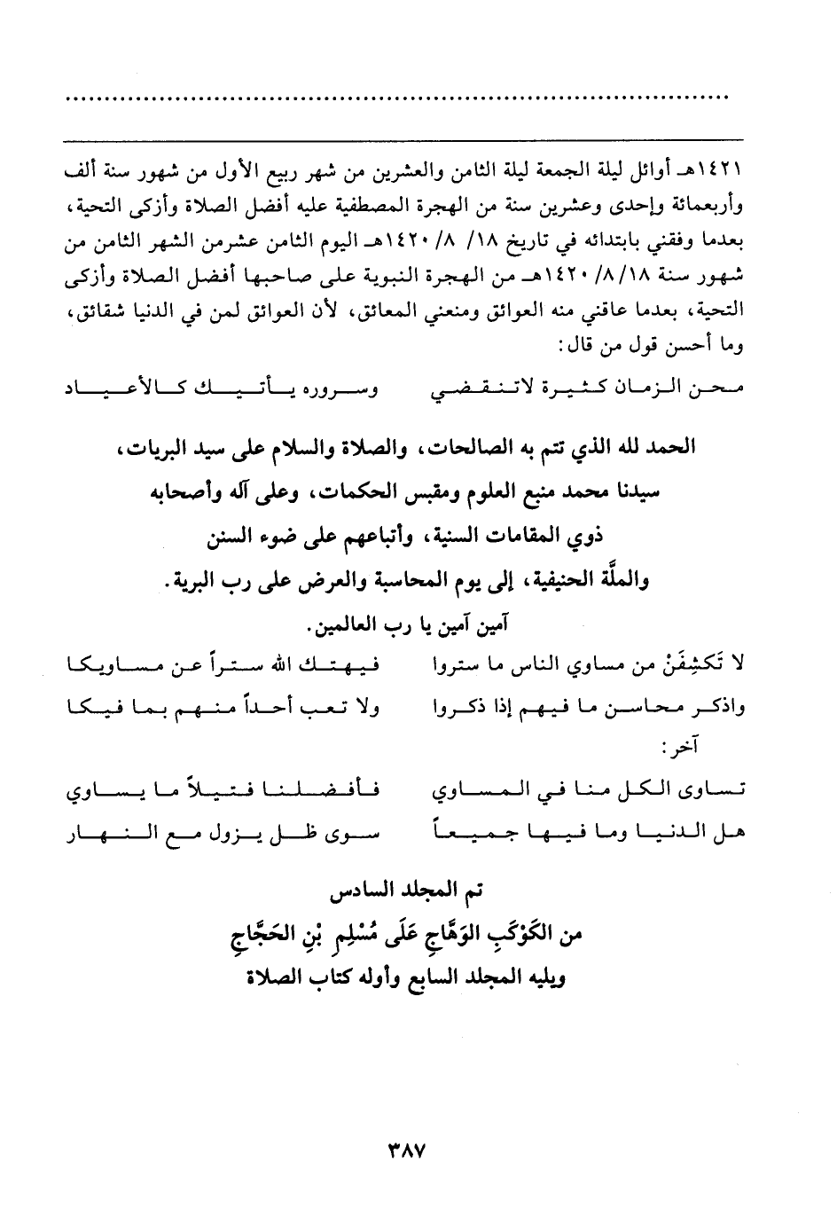 تم المجلد السادس من الكَوْكَبِ الوَهَّاجِ عَلَى مُسْلِم بْنِ الحَجَّاجِ