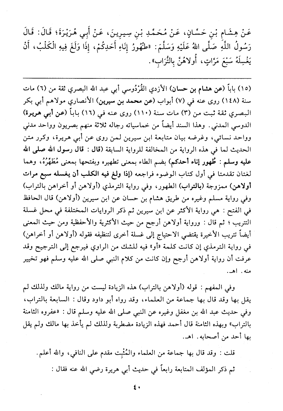 (١٥) بابا (عن هشام بن حسان) الأزدي القُرْدُوسي أبي عبد الله البصري ثقة من (٦) مات سنة (١٤٨) روى عنه في (٧) أبواب (عن محمد بن سيرين) الأنصاري مولاهم أبي بكر البصري ثقة ثبت من (٣) مات سنة (١١٠) روى عنه في (١٦) بابا (عن أبي هريرة) الدوسي المدني. وهذا السند أيضًا من خماسياته رجاله ثلاثة منهم بصريون وواحد مدني وواحد نسائي، وغرضه بيان متابعة ابن سيرين لمن روى عن أبي هريرة، وكرر متن الحديث لما في هذه الرواية من المخالفة للرواية السابقة (قال: قال رسول الله صلى الله عليه وسلم: طُهور إناء أحدكم) بضم الطاء بمعنى تطهيره وبفتحها بمعنى مُطَهِّرُهُ، وهما لغتان تقدمتا في أول كتاب الوضوء فراجعه (إذا ولغ فيه الكلب أن يغسله سبع مرات أولاهن) ممزوجة (بالتراب) الطهور، وفي رواية الترمذي (أولاهن أو أخراهن بالتراب) وفي رواية مسلم وغيره من طريق هشام بن حسان عن ابن سيرين (أولاهن) قال الحافظ في الفتح: هي رواية الأكثر عن ابن سيرين ثم ذكر الروايات المختلفة في محل غسلة التتريب؛ ثم قال: ورواية أولاهن أرجح من حيث الأكثرية والأحفظية ومن حيث المعنى أيضًا تتريب الأخيرة يقتضي الاحتياج إلى غسلة أخرى لتنظيفه فقوله (أولاهن أو أخراهن) في رواية الترمذي إن كانت كلمة "أو" فيه للشك من الراوي فيرجع إلى الترجيح وقد عرفت أن رواية أولاهن أرجح وإن كانت من كلام النبي صلى الله عليه وسلم فهو تخيير منه. اهـ.
