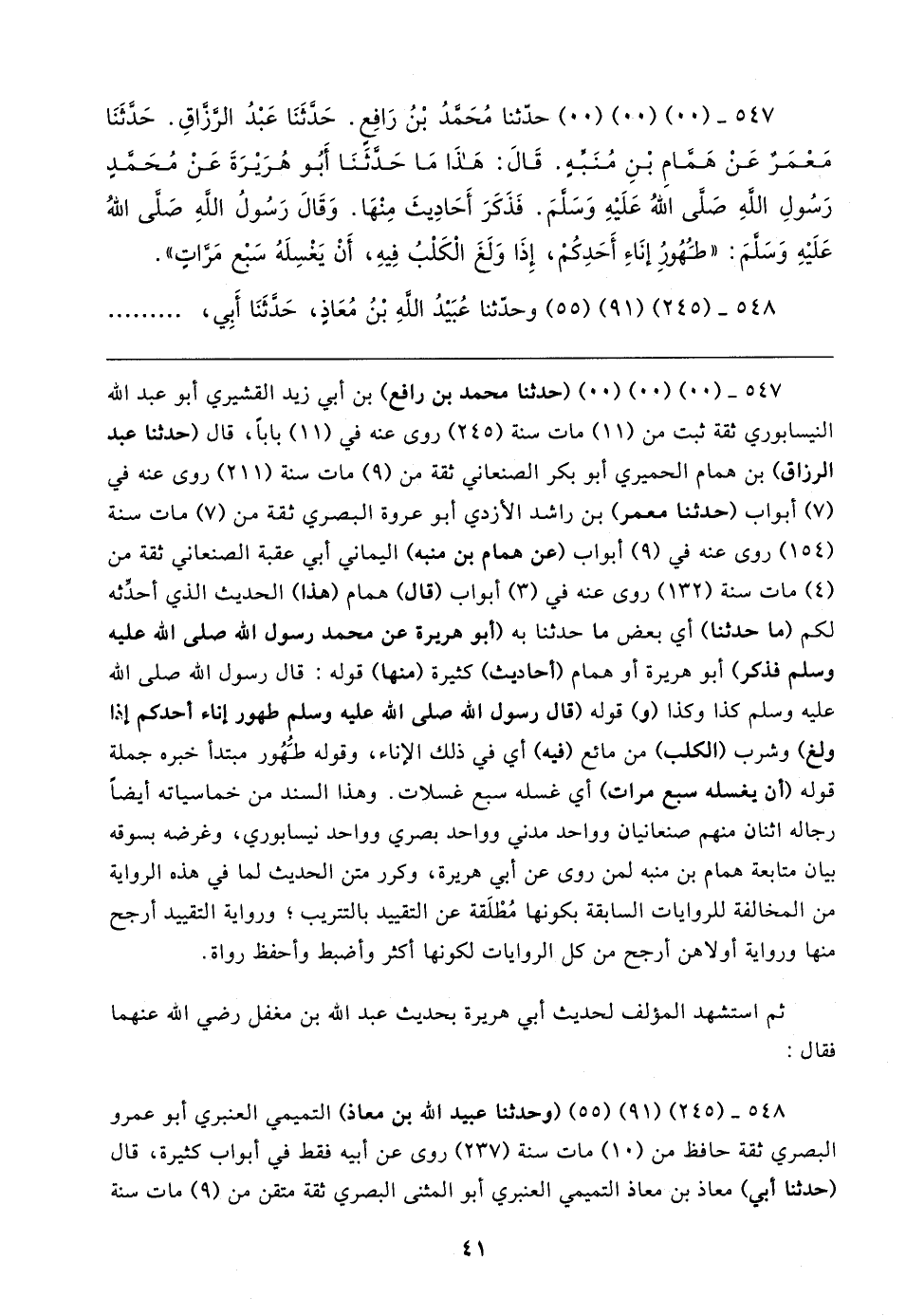 ٥٤٧ - (٠٠) (٠٠) (٠٠) (حدثنا محمد بن رافع) بن أبي زيد القشيري أبو عبد الله النيسابوري ثقة ثبت من (١١) مات سنة (٢٤٥) روى عنه في (١١) بابا، قال (حدثنا عبد الرزاق) بن همام الحميري أبو بكر الصنعاني ثقة من (٩) مات سنة (٢١١) روى عنه في (٧) أبواب (حدثنا معمر) بن راشد الأزدى أبو عروة البصري ثقة من (٧) مات سنة (١٥٤) روى عنه في (٩) أبواب (عن همام بن منبه) اليماني أبي عقبة الصنعاني ثقة من (٤) مات سنة (١٣٢) روى عنه في (٣) أبواب (قال) همام (هذا) الحديث الذي أحدِّثه لكم (ما حدثنا) أي بعض ما حدثنا به (أبو هريرة عن محمد رسول الله صلى الله عليه وسلم فذكر) أبو هريرة أو همام (أحاديث) كثيرة (منها) قوله: قال رسول الله صلى الله عليه وسلم كذا وكذا (و) قوله (قال رسول الله صلى الله عليه وسلم طهور إناء أحدكم إذا ولغ) وشرب (الكلب) من مائع (فيه) أي في ذلك الإناء، وقوله طُهُور مبتدأ خبره جملة قوله (أن يغسله سبع مرات) أي غسله سبع غسلات. وهذا السند من خماسياته أيضًا رجاله اثنان منهم صنعانيان وواحد مدني وواحد بصري وواحد نيسابوري، وغرضه بسوقه بيان متابعة همام بن منبه لمن روى عن أبي هريرة، وكرر متن الحديث لما في هذه الرواية من المخالفة للروايات السابقة بكونها مُطْلَقة عن التقييد بالتتريب؛ ورواية التقييد أرجح منها ورواية أولاهن أرجح من كل الروايات لكونها أكثر وأضبط وأحفظ رواة.