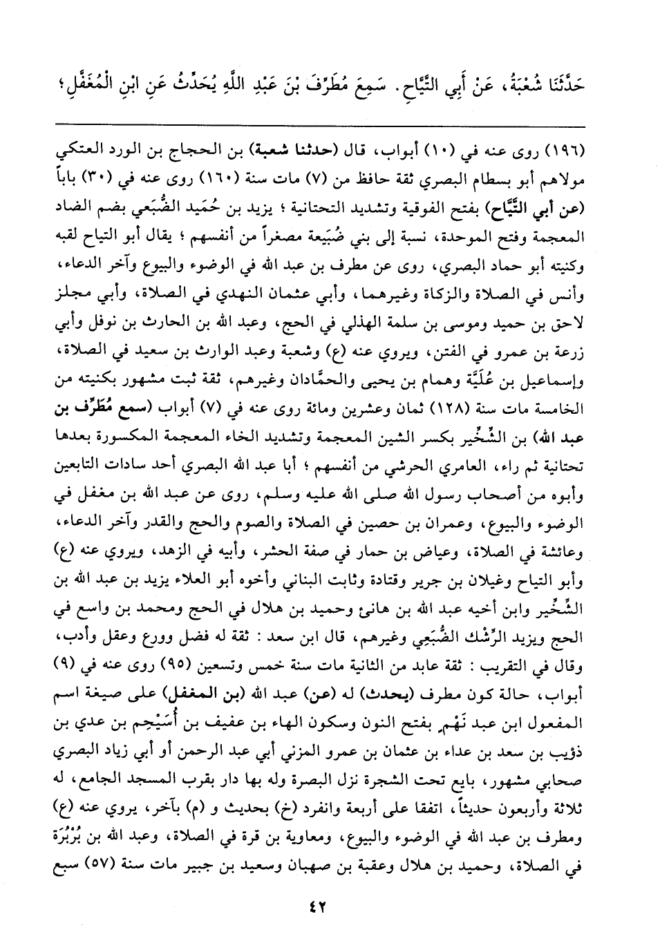 (١٩٦) روى عنه في (١٠) أبواب، قال (حدثنا شعبة) بن الحجاج بن الورد العتكي مولاهم أبو بسطام البصري ثقة حافظ من (٧) مات سنة (١٦٠) روى عنه في (٣٠) بابا (عن أبي التَّيَّاح) بفتح الفوقية وتشديد التحتانية؛ يزيد بن حُمَيد الضُّبَعي بضم الضاد المعجمة وفتح الموحدة، نسبة إلى بني ضُبَيعة مصغرًا من أنفسهم؛ يقال أبو التياح لقبه وكنيته أبو حماد البصري، روى عن مطرف بن عبد الله في الوضوء والبيوع وآخر الدعاء، وأنس في الصلاة والزكاة وغيرهما، وأبي عثمان النهدي في الصلاة، وأبي مجلز لاحق بن حميد وموسى بن سلمة الهذلي في الحج، وعبد الله بن الحارث بن نوفل وأبي زرعة بن عمرو في الفتن، ويروي عنه (ع) وشعبة وعبد الوارث بن سعيد في الصلاة، وإسماعيل بن عُلَيَّة وهمام بن يحيى والحمَّادان وغيرهم، ثقة ثبت مشهور بكنيته من الخامسة مات سنة (١٢٨) ثمان وعشرين ومائة روى عنه في (٧) أبواب (سمع مُطَرِّف بن عبد الله) بن الشِّخِّير بكسر الشين المعجمة وتشديد الخاء المعجمة المكسورة بعدها تحتانية ثم راء، العامري الحرشي من أنفسهم؛ أبا عبد الله البصري أحد سادات التابعين وأبوه من أصحاب رسول الله صلى الله عليه وسلم، روى عن عبد الله بن مغفل في الوضوء والبيوع، وعمران بن حصين في الصلاة والصوم والحج والقدر وآخر الدعاء، وعائشة في الصلاة، وعياض بن حمار في صفة الحشر، وأبيه في الزهد، ويروي عنه (ع) وأبو التياح وغيلان بن جرير وقتادة وثابت البناني وأخوه أبو العلاء يزيد بن عبد الله بن الشِّخِّير وابن أخيه عبد الله بن هانئ وحميد بن هلال في الحج ومحمد بن واسع في الحج ويزيد الرِّشْك الضُّبَعِي وغيرهم، قال ابن سعد: ثقة له فضل وورع وعقل وأدب، وقال في التقريب: ثقة عابد من الثانية مات سنة خمس وتسعين (٩٥) روى عنه في (٩) أبواب، حالة كون مطرف (يحدث) له (عن) عبد الله (بن المغفل) على صيغة اسم المفعول ابن عبد نَهْمٍ بفتح النون وسكون الهاء بن عفيف بن أُسَيحِم بن عدي بن ذؤيب بن سعد بن عداء بن عثمان بن عمرو المزني أبي عبد الرحمن أو أبي زياد البصري صحابي مشهور، بايع تحت الشجرة نزل البصرة وله بها دار بقرب المسجد الجامع، له ثلاثة وأربعون حديثًا، اتفقا على أربعة وانفرد (خ) بحديث و (م) بآخر، يروي عنه (ع) ومطرف بن عبد الله في الوضوء والبيوع، ومعاوية بن قرة في الصلاة، وعبد الله بن بُرْبُرَة في الصلاة، وحميد بن هلال وعقبة بن صهبان وسعيد بن جبير مات سنة (٥٧) سبع