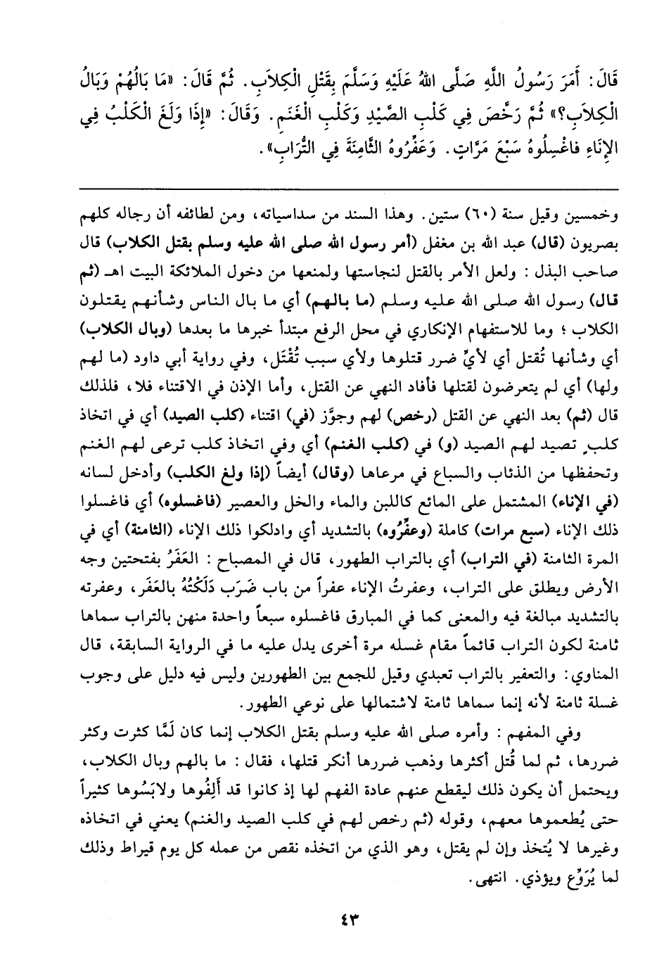 وخمسين وقيل سنة (٦٠) ستين. وهذا السند من سداسياته، ومن لطائفه أن رجاله كلهم بصريون (قال) عبد الله بن مغفل (أمر رسول الله صلى الله عليه وسلم بقتل الكلاب) قال صاحب البذل: ولعل الأمر بالقتل لنجاستها ولمنعها من دخول الملائكة البيت اهـ (ثم قال) رسول الله صلى الله عليه وسلم (ما بالهم) أي ما بال الناس وشأنهم يقتلون الكلاب؛ وما للاستفهام الإنكاري في محل الرفع مبتدأ خبرها ما بعدها (وبال الكلاب) أي وشأنها تُقتل أي لأيِّ ضرر قتلوها ولأي سبب تُقْتَل، وفي رواية أبي داود (ما لهم ولها) أي لم يتعرضون لقتلها فأفاد النهي عن القتل، وأما الإذن في الاقتناء فلا، فلذلك قال (ثم) بعد النهي عن القتل (رخص) لهم وجوَّز (في) اقتناء (كلب الصيد) أي في اتخاذ كلبٍ تصيد لهم الصيد (و) في (كلب الغنم) أي وفي اتخاذ كلب ترعى لهم الغنم وتحفظها من الذئاب والسباع في مرعاها (وقال) أيضًا (إذا ولغ الكلب) وأدخل لسانه (في الإناء) المشتمل على المائع كاللبن والماء والخل والعصير (فاغسلوه) أي فاغسلوا ذلك الإناء (سبع مرات) كاملة (وعفِّرُوه) بالتشديد أي وادلكوا ذلك الإناء (الثامنة) أي في المرة الثامنة (في التراب) أي بالتراب الطهور، قال في المصباح: العَفَرُ بفتحتين وجه الأرض ويطلق على التراب، وعفرتُ الإناء عفرًا من باب ضَرَب دَلَكْتُهُ بالعَفَر، وعفرته بالتشديد مبالغة فيه والمعنى كما في المبارق فاغسلوه سبعًا واحدة منهن بالتراب سماها ثامنة لكون التراب قائمًا مقام غسله مرة أخرى يدل عليه ما في الرواية السابقة، قال المناوي: والتعفير بالتراب تعبدي وقيل للجمع بين الطهورين وليس فيه دليل على وجوب غسلة ثامنة لأنه إنما سماها ثامنة لاشتمالها على نوعي الطهور.