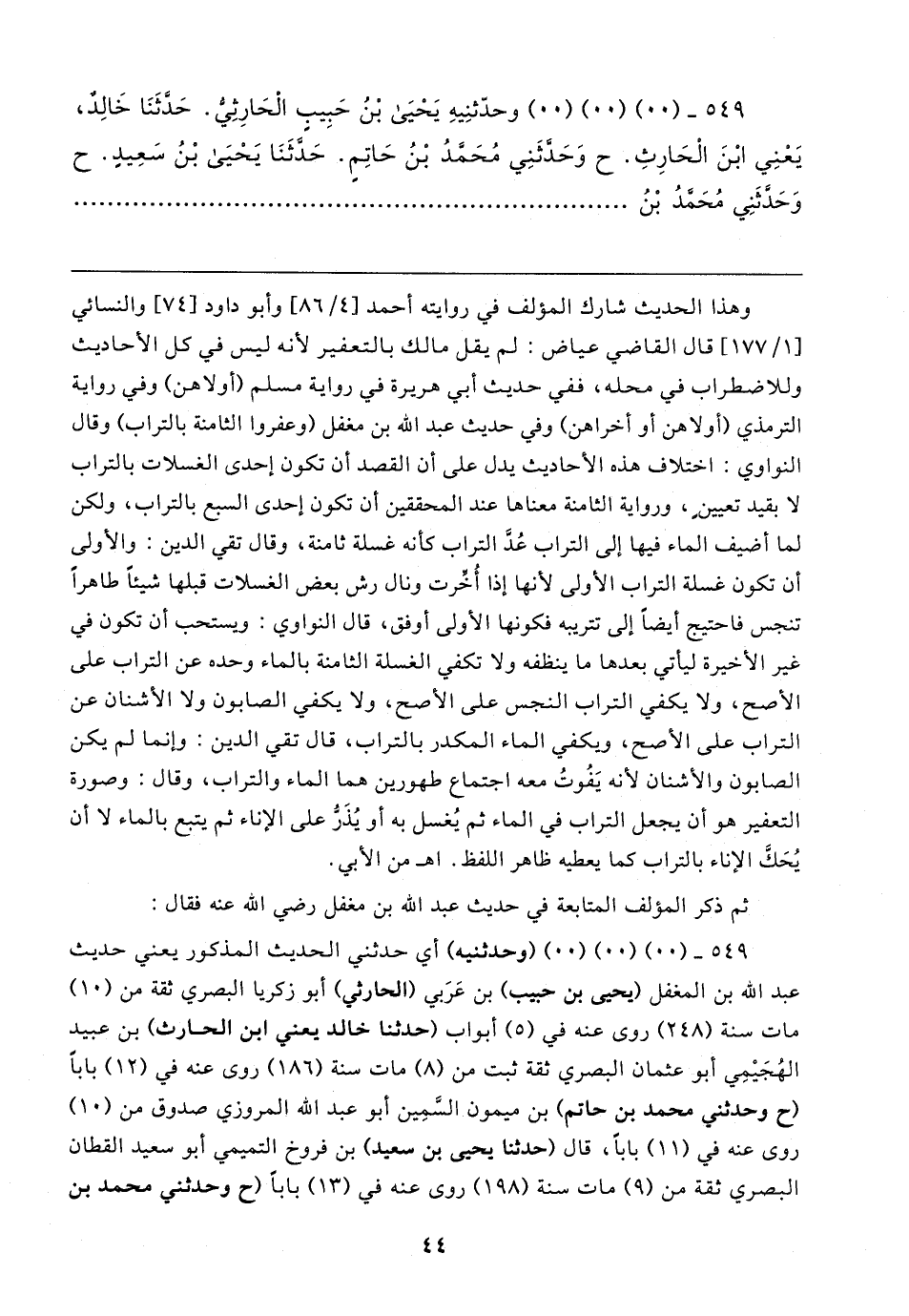 ٥٤٩ - (٠٠) (٠٠) (٠٠) (وحدثنيه) أي حدثني الحديث المذكور يعني حديث عبد الله بن المغفل (يحيى بن حبيب) بن عَرَبي (الحارثي) أبو زكريا البصري ثقة من (١٠) مات سنة (٢٤٨) روى عنه في (٥) أبواب (حدثنا خالد يعني ابن الحارث) بن عبيد الهُجَيمِي أبو عثمان البصري ثقة ثبت من (٨) مات سنة (١٨٦) روى عنه في (١٢) بابا (ح وحدثني محمد بن حاتم) بن ميمون السَّمِين أبو عبد الله المروزي صدوق من (١٠) روى عنه في (١١) بابا، قال (حدثنا يحيى بن سعيد) بن فروخ التميمي أبو سعيد القطان البصري ثقة من (٩) مات سنة (١٩٨) روى عنه في (١٣) بابا (ح وحدثني محمد بن