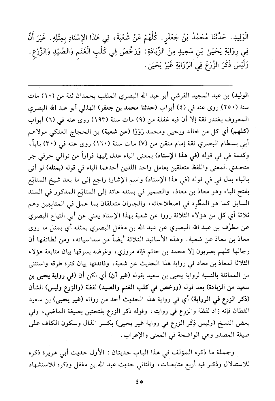 الوليد) بن عبد المجيد القرشي أبو عبد الله البصري الملقب بحمدان ثقة من (١٠) مات سنة (٢٥٠) روى عنه في (٤) أبواب (حدثنا محمد بن جعفر) الهذلي أبو عبد الله البصري المعروف بغندر ثقة إلا أن فيه غفلة من (٩) مات سنة (١٩٣) روى عنه في (٦) أبواب (كلهم) أي كل من خالد ويحيى ومحمد رَوَوْا (عن شعبة) بن الحجاج العتكي مولاهم أبي بسطام البصري ثقة إمام متقن من (٧) مات سنة (١٦٠) روى عنه في (٣٠) بابا، وكلمة في في قوله (في هذا الإسناد) بمعنى الباء عدل إليها فرارًا من توالي حرفي جر متحدي المعنى واللفظ متعلقين بعامل واحد اللذين أحدهما الباء في قوله (بمثله) لو أتى بالباء بدل في في قوله (في هذا الإسناد) واسم الإشارة راجع إلى ما بعد شيخ المتابَع بفتح الباء وهو معاذ بن معاذ، والضمير في بمثله عائد إلى المتابَع المذكور في السند السابق كما هو المطَّرِد في اصطلاحاته، والجاران متعلقان بما عمل في المتابِعِين وصم ثلاثة أي كل من هؤلاء الثلاثة رووا عن شعبة بهذا الإسناد يعني عن أبي التياح البصري عن مطرِّف بن عبد الله البصري عن عبد الله بن مغفل البصري بمثله أي بمثل ما روى معاذ بن معاذ عن شعبة. وهذه الأسانيد الثلاثة أيضًا من سداسياته، ومن لطائفها أن رجالها كلهم بصريون إلا محمد بن حاتم فإنه مروزي، وغرضه بسوقها بيان متابعة هؤلاء الثلاثة لمعاذ بن معاذ في رواية هذا الحديث عن شعبة، وفائدتها بيان كثرة طرقه واستثنى من المماثلة بالنسبة لرواية يحيى بن سعيد بقوله (غير أن) أي لكن أن (في رواية يحيى بن سعيد من الزيادة) بعد قوله (ورخص في كلب الننم والصيد) لفظة (والزرع وليس) الشأن (ذكر الزرع في الرواية) أي في رواية هذا الحديث أحد من رواته (غير يحيى) بن سعيد القطان فإنه زاد لفظة والزرع في روايته، وقوله ذكر الزرع بفتحتين بصيغة الماضي، وفي بعض النسخ (وليس ذِكْر الزرع في رواية غير يحيى) بكسر الذال وسكون الكاف على صيغة المصدر وهي الواضحة في المعنى والإعراب.