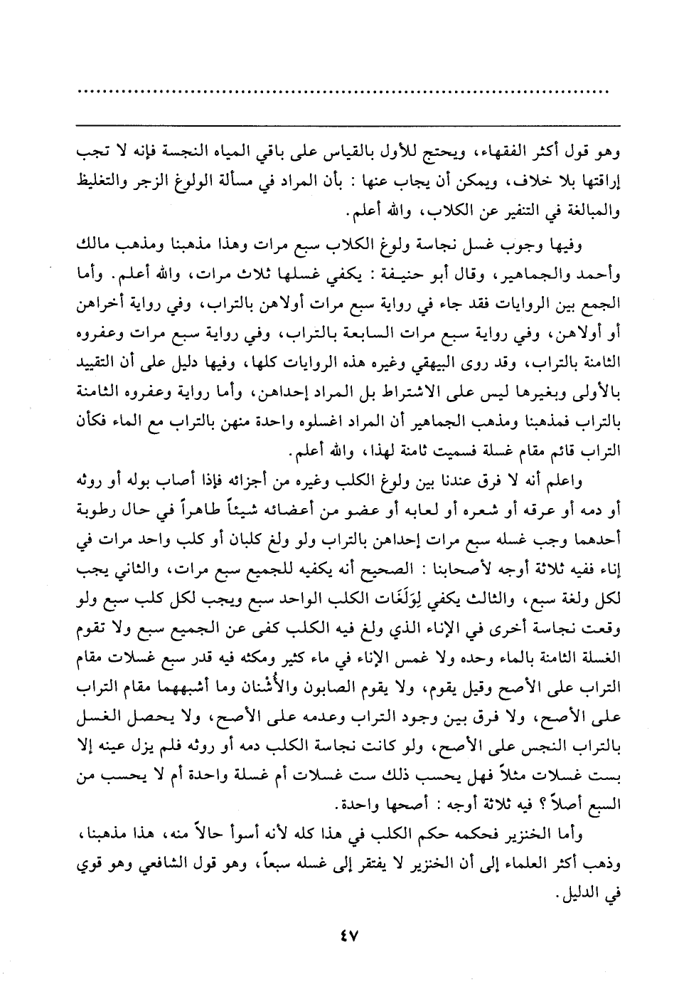 وأما الخنزير فحكمه حكم الكلب في هذا كله لأنه أسوأ حالًا منه، هذا مذهبنا، وذهب أكثر العلماء إلى أن الخنزير لا يفتقر إلى غسله سبعًا، وهو قول الشافعي وهو قوي في الدليل.