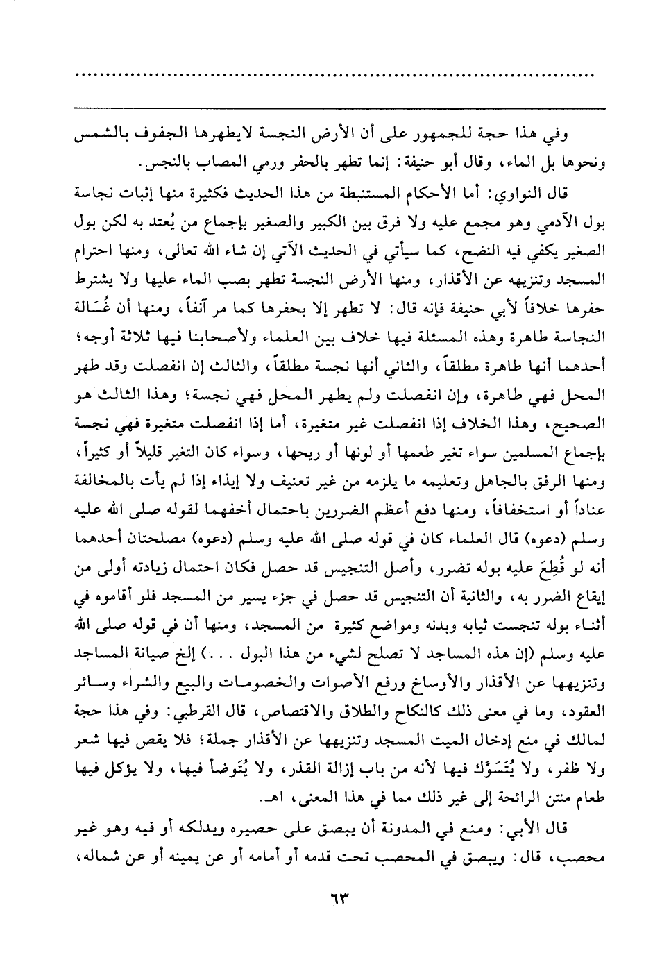 وفي هذا حجة للجمهور على أن الأرض النجسة لا يطهرها الجفوف بالشمس ونحوها بل الماء، وقال أبو حنيفة: إنما تطهر بالحفر ورمي المصاب بالنجس.