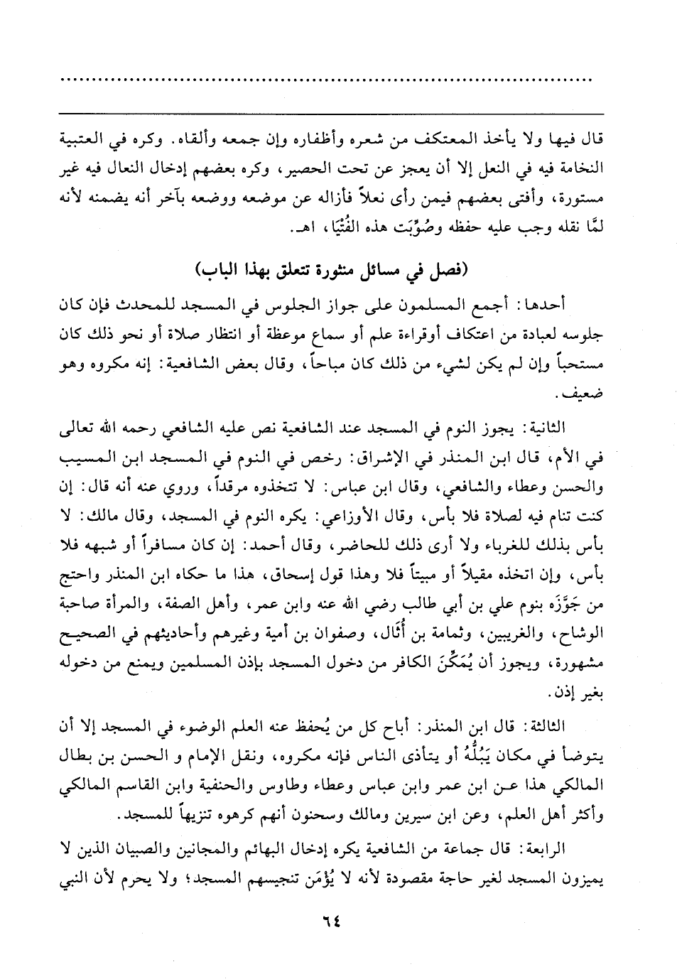 قال فيها ولا يأخذ المعتكف من شعره وأظفاره وإن جمعه وألقاه. وكره في العتبية النخامة فيه في النعل إلا أن يعجز عن تحت الحصير، وكره بعضهم إدخال النعال فيه غير مستورة، وأفتى بعضهم فيمن رأى نعلًا فأزاله عن موضعه ووضعه بآخر أنه يضمنه لأنه لمَّا نقله وجب عليه حفظه وصُوِّبَت هذه الفُتْيَا، اهـ.