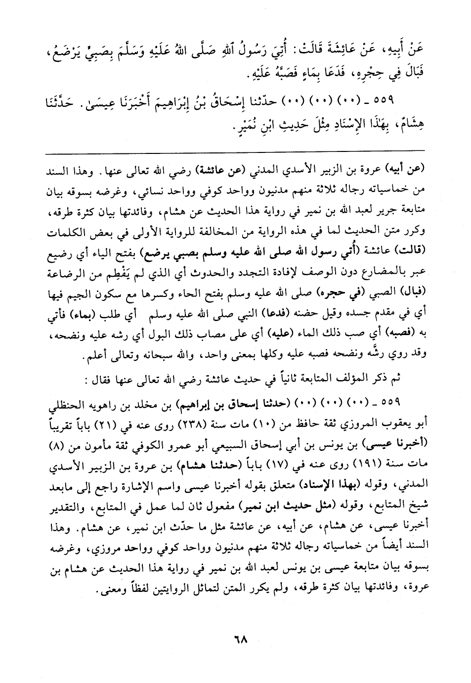 ٥٥٩ - (٠٠) (٠٠) (٠٠) (حدثنا إسحاق بن إبراهيم) بن مخلد بن راهويه الحنظلي أبو يعقوب المروزي ثقة حافظ من (١٠) مات سنة (٢٣٨) روى عنه في (٢١) بابًا تقريبًا (أخبرنا عيسى) بن يونس بن أبي إسحاق السبيعي أبو عمرو الكوفي ثقة مأمون من (٨) مات سنة (١٩١) روى عنه في (١٧) بابا (حدثنا هشام) بن عروة بن الزبير الأسدي المدني، وقوله (بهذا الإسناد) متعلق بقوله أخبرنا عيسى واسم الإشارة راجع إلى مابعد شيخ المتابع، وقوله (مثل حديث ابن نمير) مفعول ثان لما عمل في المتابع، والتقدير أخبرنا عيسى، عن هشام، عن أبيه، عن عائشة مثل ما حدّث ابن نمير، عن هشام. وهذا السند أيضًا من خماسياته رجاله ثلاثة منهم مدنيون وواحد كوفي وواحد مروزي، وغرضه بسوقه بيان متابعة عيسى بن يونس لعبد الله بن نمير في رواية هذا الحديث عن هشام بن عروة، وفائدتها بيان كثرة طرقه، ولم يكرر المتن لتماثل الروايتين لفظًا ومعنى.