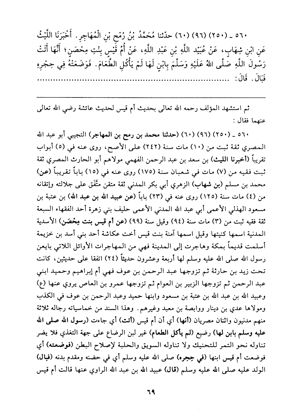 ٥٦٠ - (٢٥٠) (٩٦) (٦٠) (حدثنا محمد بن رمح بن المهاجر) التجيبي أبو عبد الله المصري ثقة ثبت من (١٠) مات سنة (٢٤٢) على الأصح، روى عنه في (٥) أبواب تقريبًا (أخبرنا الليث) بن سعد بن عبد الرحمن الفهمي مولاهم أبو الحارث المصري ثقة ثبت فقيه من (٧) مات في شعبان سنة (١٧٥) روى عنه في (١٥) بابًا تقريبًا (عن) محمد بن مسلم (بن شهاب) الزهري أبي بكر المدني ثقة متقن متَّفَق على جلالته وإتقانه من (٤) مات سنة (١٢٥) روى عنه في (٢٣) بابا (عن عبيد الله بن عبد الله) بن عتبة بن مسعود الهذلي الأعمى أبي عبد الله المدني الأعمى حليف بني زهرة أحد الفقهاء السبعة ثقة فقيه ثبت من (٣) مات سنة (٩٤) وقيل سنة (٩٩) (عن أم قيس بنت مِحْصَن) الأسدية المدنية اسمها كنيتها وقيل اسمها آمنة بنت قيس أخت عكاشة أحد بني أسد بن خزيمة أسلمت قديمًا بمكة وهاجرت إلى المدينة فهي من المهاجرات الأوائل اللاتي بايعن رسول الله صلى الله عليه وسلم لها أربعة وعشرون حديثًا (٢٤) اتفقا على حديثين، كانت تحت زيد بن حارثة ثم تزوجها عبد الرحمن بن عوف فهي أم إبراهيم وحميد ابني عبد الرحمن ثم تزوجها الزبير بن العوام ثم تزوجها عمرو بن العاص يروي عنها (ع) وعبيد الله بن عبد الله بن عتبة بن مسعود وابنها حميد وعبد الرحمن بن عوف في الكذب ومولاها عدي بن دينار ووابصة بن معبد وغيرهم. وهذا السند من خماسياته رجاله ثلاثة منهم مدنيون واثنان مصريان (أنها) أي أن أم قيس (أتت) أي جاءت (رسول الله صلى الله عليه وسلم بابن لها) رضيع (لم يأكل الطعام) غير لبن الرضاع على جهة التغذي فلا يضر تناوله نحو التمر للتحنيك ولا تناوله السويق والحلبة لإصلاح البطن (فوضعته) أي فوضعت أم قيس ابنها (في حِجره) صلى الله عليه وسلم أي في حضنه ومقدم بدنه (فبال) الولد عليه صلى الله عليه وسلم (قال) عبيد الله بن عبد الله الراوي عنها قالت أم قيس