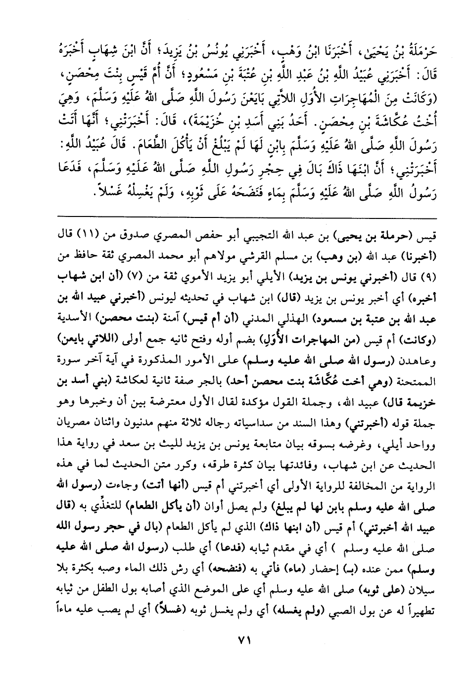 حَرْمَلَةُ بْنُ يَحْيَى، أَخْبَرَنَا ابْنُ وَهْبٍ، أَخْبَرَنِي يُونُسُ بْنُ يَزِيدَ؛ أَنَّ ابْنَ شِهَابٍ أَخْبَرَهُ قَال: أَخْبَرَنِي عُبَيدُ اللهِ بْنُ عَبْدِ اللهِ بْنِ عُتْبَةَ بْنِ مَسْعُودٍ؛ أَنَّ أُمَّ قَيسٍ بِنْتَ مِحْصَنٍ، (وَكَانَتْ مِنَ الْمُهَاجِرَاتِ الأُوَلِ اللَّاتِي بَايَعْنَ رَسُولَ اللهِ صَلَّى اللهُ عَلَيهِ وَسَلَّمَ، وَهِيَ أُخْتُ عُكَّاشَةَ بْنِ مِحْصنٍ. أَحَدُ بَنِي أَسَدِ بْنِ خُزَيمَةَ)، قَال: أَخْبَرَتْنِي؛ أَنَّهَا أَتَتْ رَسُولَ اللهِ صَلَّى اللهُ عَلَيهِ وَسَلَّمَ بِابْنٍ لَهَا لَمْ يَبْلُغْ أَنْ يَأْكُلَ الطَّعَامَ. قَال عُبَيدُ اللهِ: أَخْبَرَتْنِي؛ أَنَّ ابْنَهَا ذَاكَ بَال فِي حِجْرِ رَسُولِ اللهِ صَلَّى اللهُ عَلَيهِ وَسَلَّمَ، فَدَعَا رَسُولُ اللهِ صَلَّى اللهُ عَلَيهِ وَسَلَّمَ بِمَاءٍ فَنَضَحَهُ عَلَى ثَوْبِهِ، وَلَمْ يَغسِلْهُ غَسْلًا