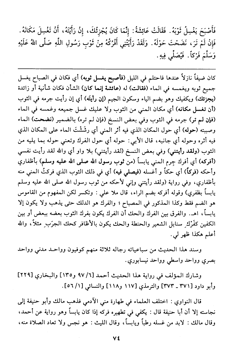 كان ضيفًا نازلًا عندها فاحتلم في الليل (فأصبح يغسل ثوبه) أي فكان في الصباح يغسل جميع ثوبه ويغمسه في الماء (فقالت) له (عائشة إنما كان) الشأن فكان شأنية أو زائدة (يجزئك) ويكفيك وهو بضم الياء وسكون الجيم (إن رأيتَه) أي إن رأيت جرمه في الثوب (أن تغسل مكانه) أي مكان المني من الثوب ولا عليك غسل جميعه وغمسه في الماء (فإن لم تر) جرمه في الثوب وفي بعض النسخ (فإن لم تره) بالضمير (نضحت) الماء وصببته (حوله) أي حول المكان الذي فيه أثر المني أي رشَشْتَ الماء على المكان الذي فيه أثره وحوله أي جانبه، قال الأبي: حوله أي حول الفرك وتعني حوله بما يليه من الثوب (ولقد رأيتني) وفي بعض النسخ (لقد رأيتني) بلا واو أي والله لقد رأيت نفسي (أفركه) أي أفرك جِرم المني يابسًا (من ثوب رسول الله صلى الله عليه وسلم) بأظفاري وأحكه (فركًا) أي حكًا وأغسله (فيصلي فيه) أي في ذلك الثوب الذي فركتُ المني منه بأظفاري، وفي رواية (ولقد رأيتني وإني لأحكه من ثوب رسول الله صلى الله عليه وسلم يابسًا بظفري) وقوله أفركه بضم الراء، قال ملا علي: وتكسر لكن المفهوم من القاموس هو الضم فقط وكذا المذكور في المصباح؛ والفرك هو الدلك حتى يذهب ولا يكون إلا يابسًا، اهـ. والفرق بين الفرك والحك أن الفرك يكون بفرك الثوب بعضه ببعض أو بين الكفين كفَرْكِ سنابل الشعير والحنطة والحك يكون بالأظافر كحك الجرَبِ مثلًا، والله أعلم هكذا ظهر لي.