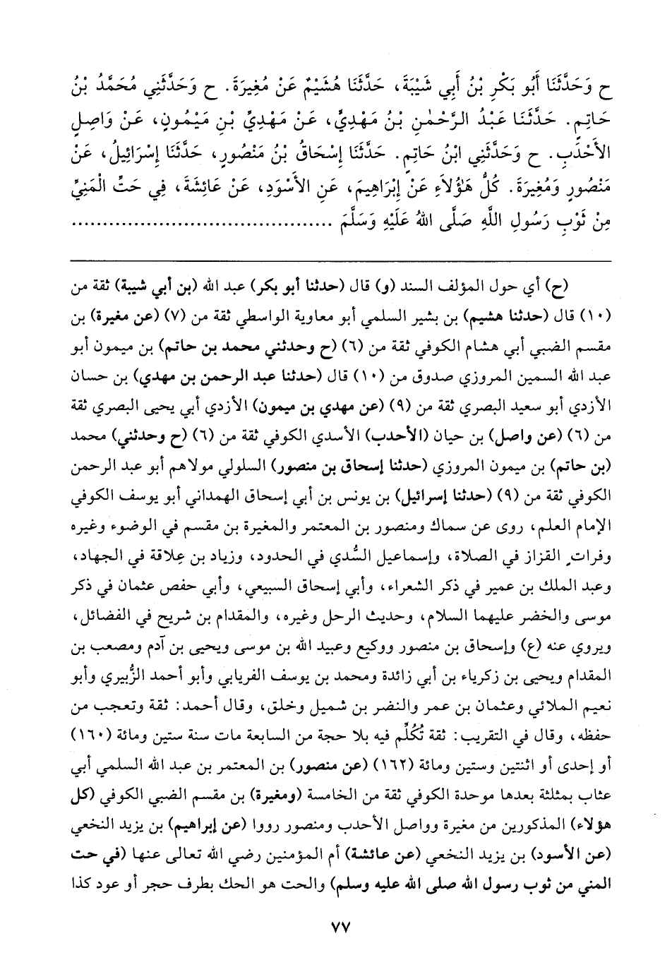 (ح) أي حول المؤلف السند (و) قال (حدثنا أبو بكر) عبد الله (بن أبي شيبة) ثقة من (١٠) قال (حدثنا هشيم) بن بشير السلمي أبو معاوية الواسطي ثقة من (٧) (عن مغيرة) بن مقسم الضبي أبي هشام الكوفي ثقة من (٦) (ح وحدثني محمد بن حاتم) بن ميمون أبو عبد الله السمين المروزي صدوق من (١٠) قال (حدثنا عبد الرحمن بن مهدي) بن حسان الأزدي أبو سعيد البصري ثقة من (٩) (عن مهدي بن ميمون) الأزدي أبي يحيى البصري ثقة من (٦) (عن واصل) بن حيان (الأحدب (الأسدي الكوفي ثقة من (٦) (ح وحدثني) محمد (بن حاتم) بن ميمون المروزي (حدثنا إسحاق بن منصور) السلولي مولاهم أبو عبد الرحمن الكوفي ثقة من (٩) (حدثنا إسرائيل) بن يونس بن أبي إسحاق الهمداني أبو يوسف الكوفي الإمام العلم، روى عن سماك ومنصور بن المعتمر والمغيرة بن مقسم في الوضوء وغيره وفراتٍ القزاز في الصلاة، وإسماعيل السُّدي في الحدود، وزياد بن عِلاقة في الجهاد، وعبد الملك بن عمير في ذكر الشعراء، وأبي إسحاق السبيعي، وأبي حفص عثمان في ذكر موسى والخضر عليهما السلام، وحديث الرحل وغيره، والمقدام بن شريح في الفضائل، ويروي عنه (ع) وإسحاق بن منصور ووكيع وعبيد الله بن موسى ويحيى بن آدم ومصعب بن المقدام ويحيى بن زكرياء بن أبي زائدة ومحمد بن يوسف الفريابي وأبو أحمد الزُّبيري وأبو نعيم الملائي وعثمان بن عمر والنضر بن شميل وخلق، وقال أحمد: ثقة وتعجب من حفظه، وقال في التقريب: ثقة تُكُلِّم فيه بلا حجة من السابعة مات سنة ستين ومائة (١٦٠) أو إحدى أو اثنتين وستين ومائة (١٦٢) (عن منصور) بن المعتمر بن عبد الله السلمي أبي عثاب بمثلثة بعدها موحدة الكوفي ثقة من الخامسة (ومغيرة) بن مقسم الضبي الكوفي (كل هؤلاء) المذكورين من مغيرة وواصل الأحدب ومنصور رووا (عن إبراهيم) بن يزيد النخعي (عن الأسود) بن يزيد النخعي (عن عائشة) أم المؤمنين رضي الله تعالى عنها (في حت المني من ثوب رسول الله صلى الله عليه وسلم) والحت هو الحك بطرف حجر أو عود كذا