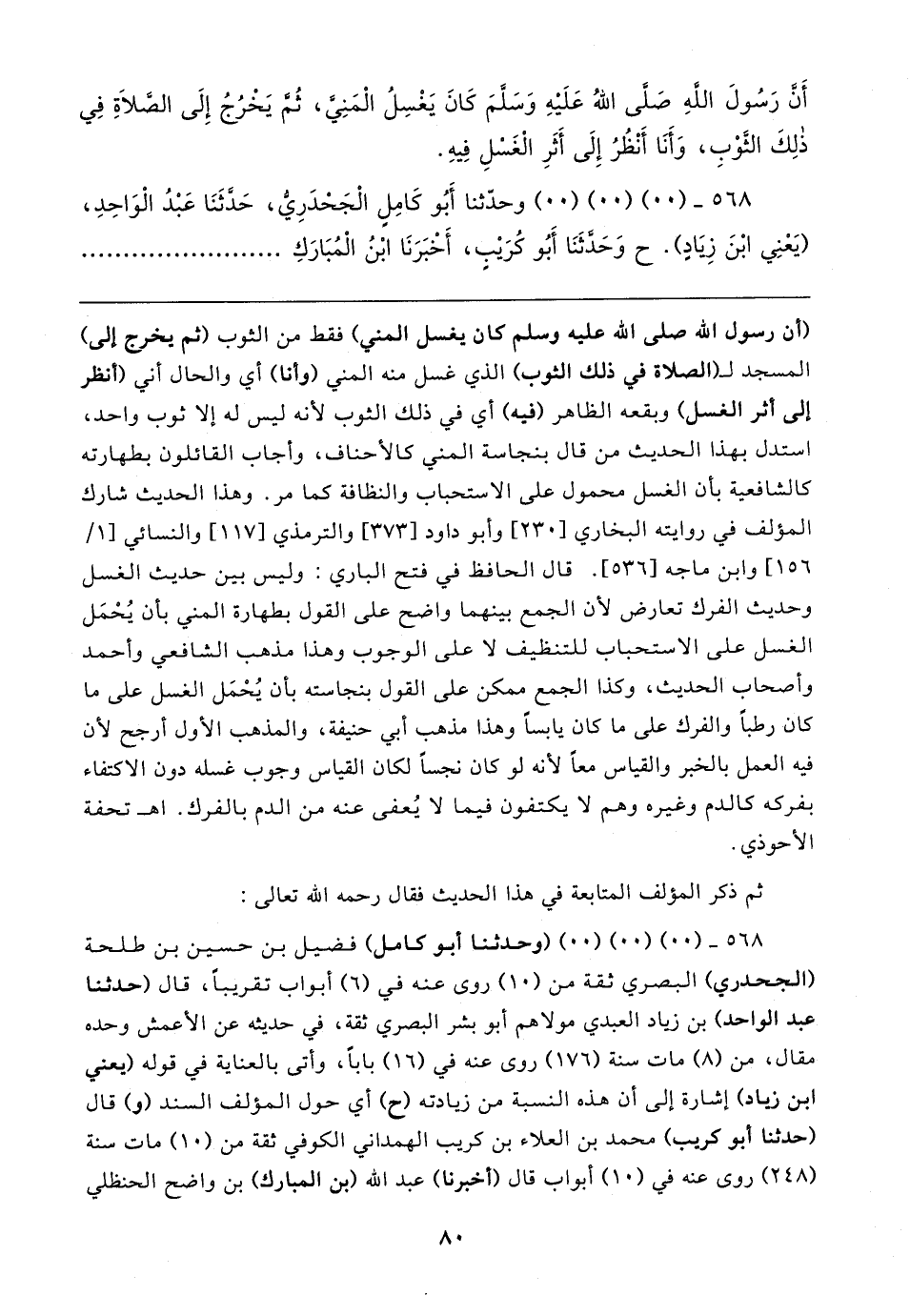 (أن رسول الله صلى الله عليه وسلم كان يغسل المني) فقط من الثوب (ثم يخرج إلى) المسجد لـ (الصلاة في ذلك الثوب) الذي غسل منه المني (وأنا) أي والحال أني (انظر إلى أثر الغسل) وبقعه الظاهر (فيه) أي في ذلك الثوب لأنه ليس له إلا ثوب واحد، استدل بهذا الحديث من قال بنجاسة المني كالأحناف، وأجاب القائلون بطهارته كالشافعية بأن الغسل محمول على الاستحباب والنظافة كما مر. وهذا الحديث شارك المؤلف في روايته البخاري [٢٣٠]، وأبو داود [٣٧٣]، والترمذي [١١٧]، والنسائي [١/ ١٥٦] وابن ماجه [٥٣٦]. قال الحافظ في فتح الباري: وليس بين حديث الغسل وحديث الفرك تعارض لأن الجمع بينهما واضح على القول بطهارة المني بأن يُحْمَل الغسل على الاستحباب للتنظيف لا على الوجوب وهذا مذهب الشافعي وأحمد وأصحاب الحديث، وكذا الجمع ممكن على القول بنجاسته بأن يُحْمَل الغسل على ما كان رطبًا والفرك على ما كان يابسًا وهذا مذهب أبي حنيفة، والمذهب الأول أرجح لأن فيه العمل بالخبر والقياس معًا لأنه لو كان نجسًا لكان القياس وجوب غسله دون الاكتفاء بفركه كالدم وغيره وهم لا يكتفون فيما لا يُعفى عنه من الدم بالفرك. اهـ تحفة الأحوذي.