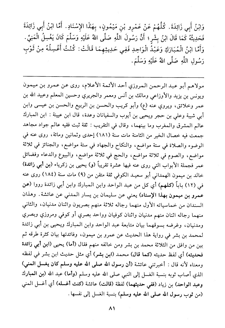 وَابْنُ أَبِي زَائِدَةَ. كُلُّهُمْ عَنْ عَمْرِو بْنِ مَيمُونٍ، بِهَذَا الإِسْنَادِ. أما ابْنُ أَبِي زَائِدَةَ فَحَدِيثُهُ كَمَا قَال ابْنُ بِشْرٍ؛ أَن رَسُولَ الله صلى اللهُ عَلَيهِ وَسلمَ كَانَ يَغْسِلُ الْمَنِيَّ. وَأَمَّا ابْنُ الْمُبَارَكِ وَعَبْدُ الْوَاحِدِ فَفِي حَدِيثِهِمَا قَالتْ: كُنْتُ أَغْسِلُهُ مِنْ ثَوْبِ رَسُولِ الله صلى اللهُ عَلَيهِ وَسلمَ