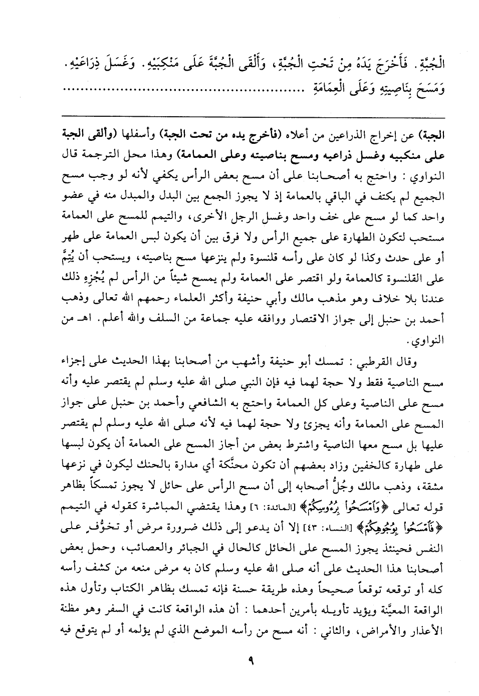وقال القرطبي: تمسك أبو حنيفة وأشهب من أصحابنا بهذا الحديث على إجزاء مسح الناصية فقط ولا حجة لهما فيه فإن النبي صلى الله عليه وسلم لم يقتصر عليه وأنه مسح على الناصية وعلى كل العمامة واحتج به الشافعي وأحمد بن حنبل على جواز المسح على العمامة وأنه يجزئ ولا حجة لهما فيه لأنه صلى الله عليه وسلم لم يقتصر عليها بل مسح معها الناصية واشترط بعض من أجاز المسح على العمامة أن يكون لبسها على طهارة كالخفين وزاد بعضهم أن تكون محنَّكة أي مدارة بالحنك ليكون في نزعها مشقة، وذهب مالك وجُلُّ أصحابه إلى أن مسح الرأس على حائل لا يجوز تمسكًا بظاهر قوله تعالى {وَامْسَحُوا بِرُءُوسِكُمْ} [المائدة: ٦] وهذا يقتضي المباشرة كقوله في التيمم {فَامْسَحُوا بِوُجُوهِكُمْ} [النساء: ٤٣] إلا أن يدعو إلى ذلك ضرورة مرض أو تخوُّفٍ على النفس فحينئذ يجوز المسح على الحائل كالحال في الجبائر والعصائب، وحمل بعض أصحابنا هذا الحديث على أنه صلى الله عليه وسلم كان به مرض منعه من كشف رأسه كله أو توقعه توقعًا صحيحًا وهذه طريقة حسنة فإنه تمسك بظاهر الكتاب وتأول هذه الواقعة المعيَّنة ويؤيد تأويله بامرين أحدهما: أن هذه الواقعة كانت في السفر وهو مظنة الأعذار والأمراض، والثاني: أنه مسح من رأسه الموضع الذي لم يؤلمه أو لم يتوقع فيه