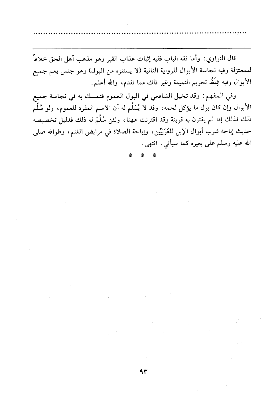 وفي المفهم: وقد تخيل الشافعي في البول العموم فتمسك به في نجاسة جميع الأبوال وإن كان بول ما يؤكل لحمه، وقد لا يُسَلَّم له أن الاسم المفرد للعموم، ولو سُلِّم ذلك فذلك إذا لم يقترن به قرينة وقد اقترنت ها هنا, ولئن سُلمَ له ذلك فدليل تخصيصه حديث إباحة شرب أبوال الإبل للعُرَنِيين، وإباحة الصلاة في مرابض الغنم، وطوافه صلى الله عليه وسلم على بعيره كما سيأتي. انتهى.