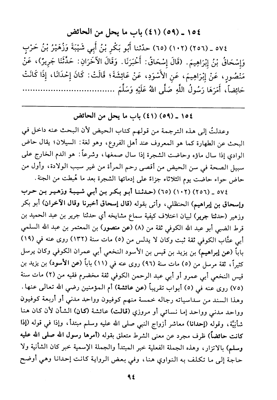 ٥٧٤ - (٢٥٦) (١٠٢) (٦٥) (حدثنا أبو بكر بن أبي شيبة وزهير بن حرب وإسحاق بن إبراهيم) الحنظلي، وأتى بقوله (قال إسحاق أخبرنا وقال الأخران) أبو بكر وزهير (حدثنا جرير) لبيان اختلاف كيفية سماع مشايخه أي حدثنا جرير بن عبد الحميد بن قرط الضبي أبو عبد الله الكوفي ثقة من (٨) (عن منصور) بن المعتمر بن عبد الله السلمي أبي عتَّاب الكوفي ثقة ثبت وكان لا يدلس من (٥) مات سنة (١٣٢) روى عنه في (١٩) بابا (عن إبراهيم) بن يزيد بن قيس بن الأسود النخعي أبي عمران الكوفي وكان يرسل كثيرًا، ثقة مرسل من (٥) مات سنة (٩٦) روى عنه في (١١) بابا (عن الأسود) بن يزيد بن قيس النخعي أبي عمرو أو أبي عبد الرحمن الكوفي ثقة مخضرم فقيه من (٢) مات سنة (٧٥) روى عنه في (٥) أبواب تقريبًا (عن عائشة) أم المؤمنين رضي الله تعالى عنها. وهذا السند من سداسياته رجاله خمسة منهم كوفيون وواجد مدني أو أربعة كوفيون وواحد مدني وواحد إما نسائي أو مروزي (قالت) عائشة (كان) الشأن لأن كان هنا شأنيَّة، وقوله (إحدانا) معاشر أزواج النبي صلى الله عليه وسلم مبتدأ، وإذا في قوله (إذا كانت حائضًا) ظرف مجرد عن معنى الشرط متعلق بقوله (أمرها رسول الله صلى الله عليه وسلم) بالاتزار، وهذه الجملة الفعلية خبر المبتدأ والجملة الإسمية خبر كان الشأنية ولا حاجة إلى ما تكلف به النواوي هنا، وفي بعض الرواية كانت إحدانا وهي أوضح
