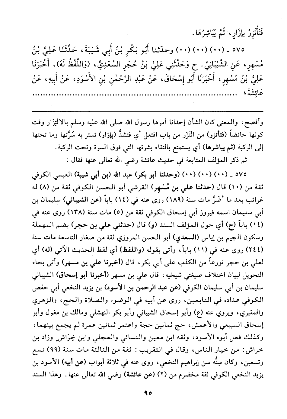 ٥٧٥ - (٠٠) (٠٠) (٠٠) (وحدثنا أبو بكر) عبد الله (بن أبي شيبة) العبسي الكوفي ثقة من (١٠) قال (حدثنا علي بن مُسْهِر) القرشي أبو الحسن الكوفي ثقة من (٨) له غرائب بعد ما أضَرَّ مات سنة (١٨٩) روى عنه في (١٤) بابا (عن الشيباني) سليمان بن أبي سليمان اسمه فيروز أبي إسحاق الكوفي ثقة من (٥) مات سنة (١٣٨) روى عنه في (١٤) بابا (ح) أي حول المؤلف السند (و) قال (حدثني علي بن حجر) بضم المهملة وسكون الجيم بن إياس (السعدي) أبو الحسن المروزي ثقة من صغار التاسعة مات سنة (٢٤٤) روى عنه في (١١) بابا، وأتى بقوله (واللفظ) أي لفظ الحديث الآتي (له) أي لعلي بن حجر تورعًا من الكذب على أبي بكر، قال (أخبرنا علي بن مسهر) وأتى بحاء التحويل لبيان اختلاف صيغتي شيخيه، قال علي بن مسهر (أخبرنا أبو إسحاق) الشيباني سليمان بن أبي سليمان الكوفي (عن عبد الرحمن بن الأسود) بن يزيد النخعي أبي حفص الكوفي عداده في التابعين، روى عن أبيه في الوضوء والصلاة والحج، والزهري والمقبري، ويروي عنه (ع) وأبو إسحاق الشيباني وأبو بكر النهشلي ومالك بن مغول وأبو إسحاق السبيعي والأعمش، حج ثمانين حجة واعتمر ثمانين عمرة لم يجمع بينهما، وكذلك فعل أبوه الأسود، وثقه ابن معين والنسائي والعجلي وابن خِرَاشٍ وزاد بن خراش: من خيار الناس، وقال في التقريب: ثقة من الثالثة مات سنة (٩٩) تسع وتسعين، وكان سِنُّه من إبراهيم النخعي، روى عنه في ثلاثة أبواب (عن أبيه) الأسود بن يزيد النخعي الكوفي ثقة مخضرم من (٢) (عن عائشة) رضي الله تعالى عنها. وهذا السند